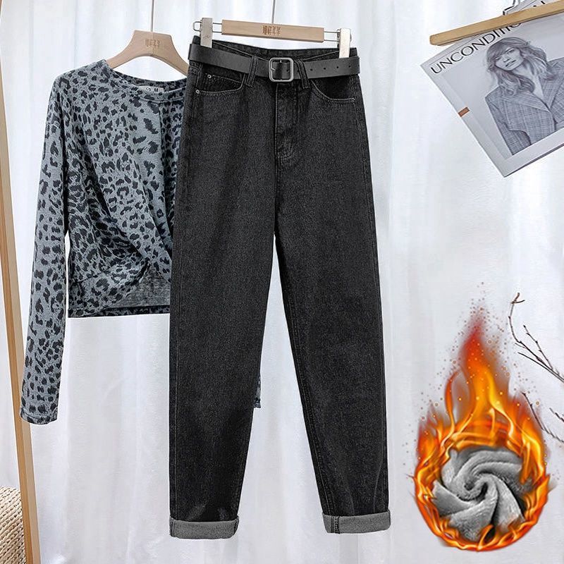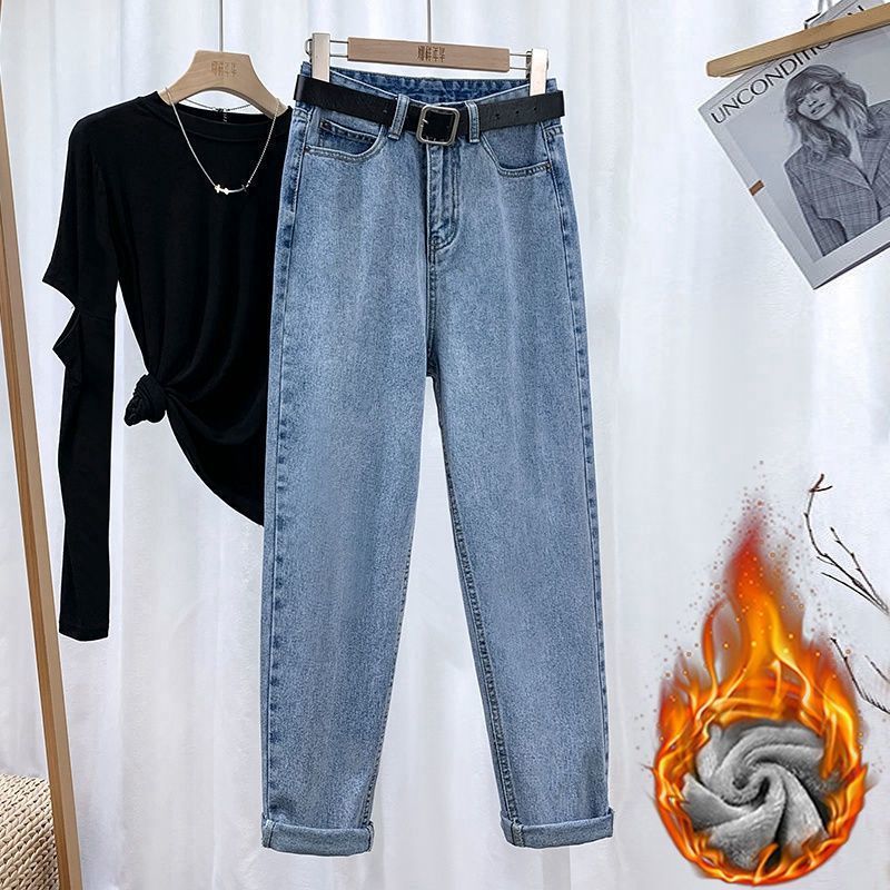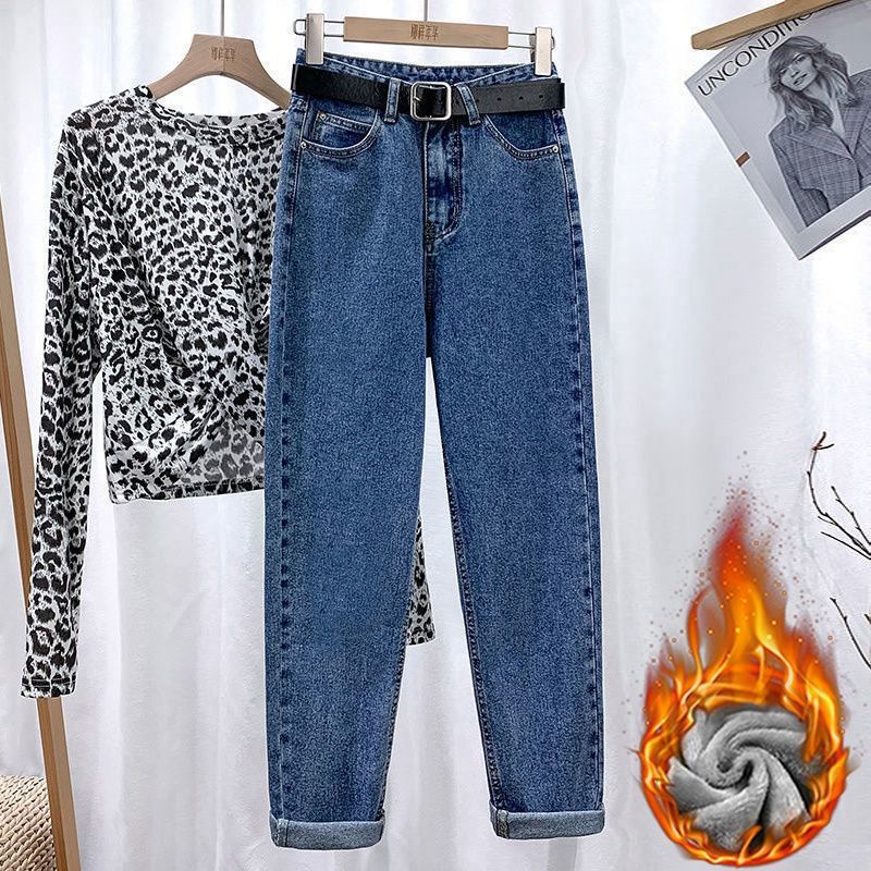高腰阔腿牛仔裤女秋冬装2021年新款显瘦直筒宽松加绒加厚保暖裤子