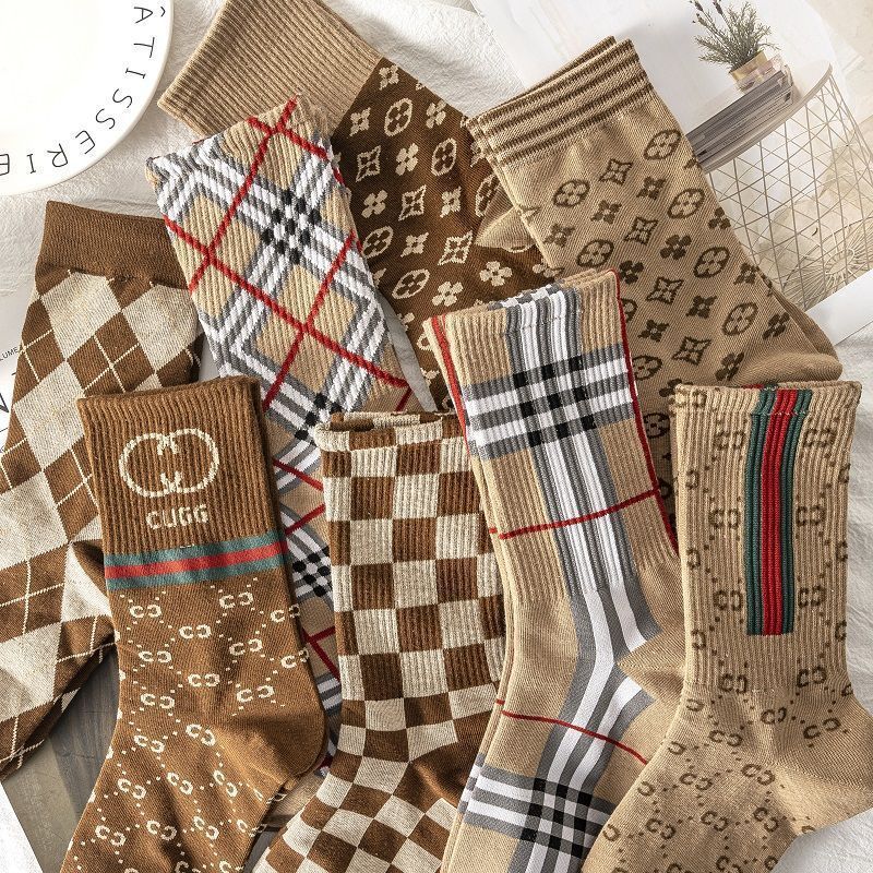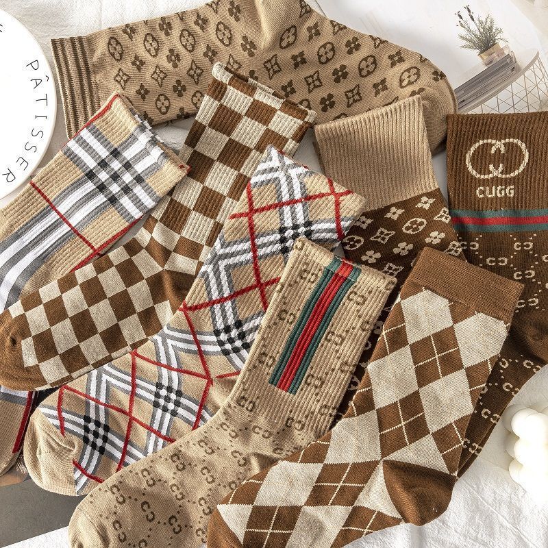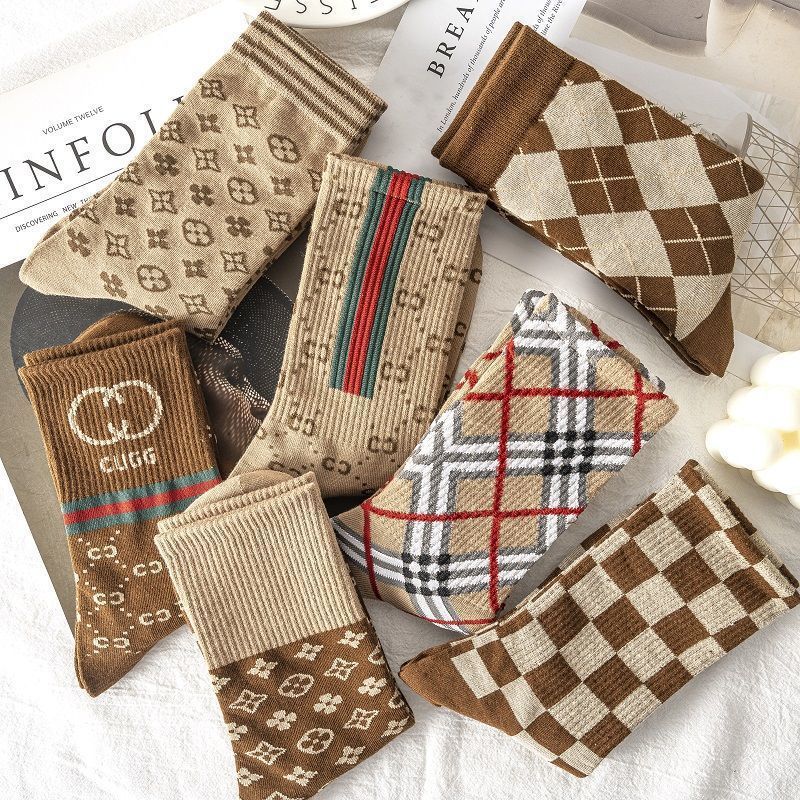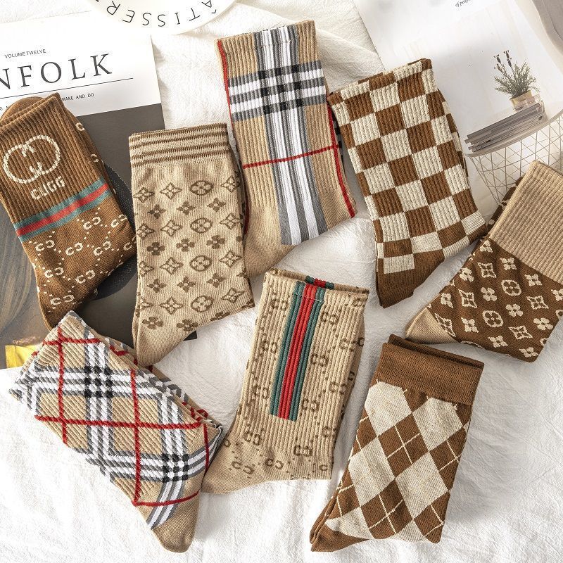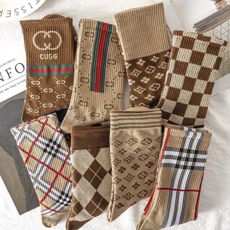 美式复古袜子女秋冬中筒长袜格纹条纹咖色棉袜长筒韩国ins潮女士