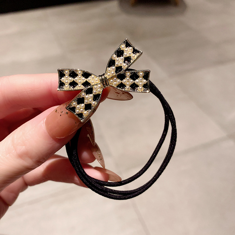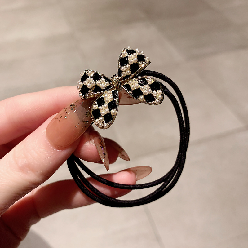 韩国棋盘格蝴蝶结珍珠头绳女扎头发马尾发圈简约气质丸子头发饰