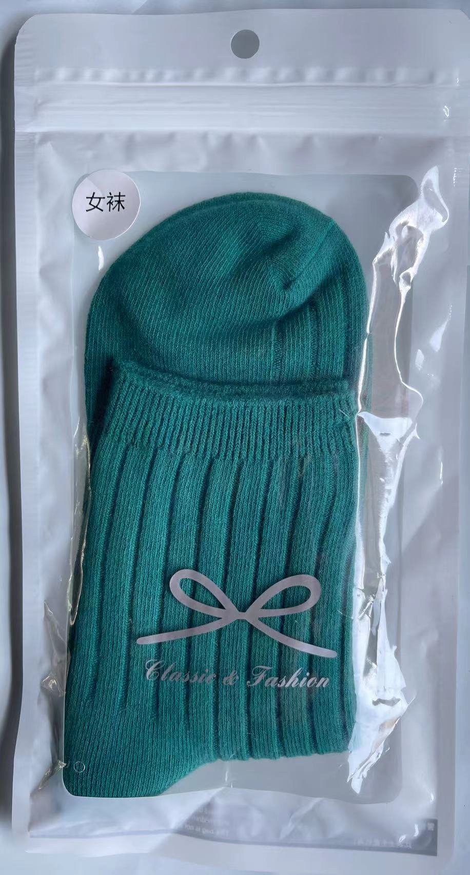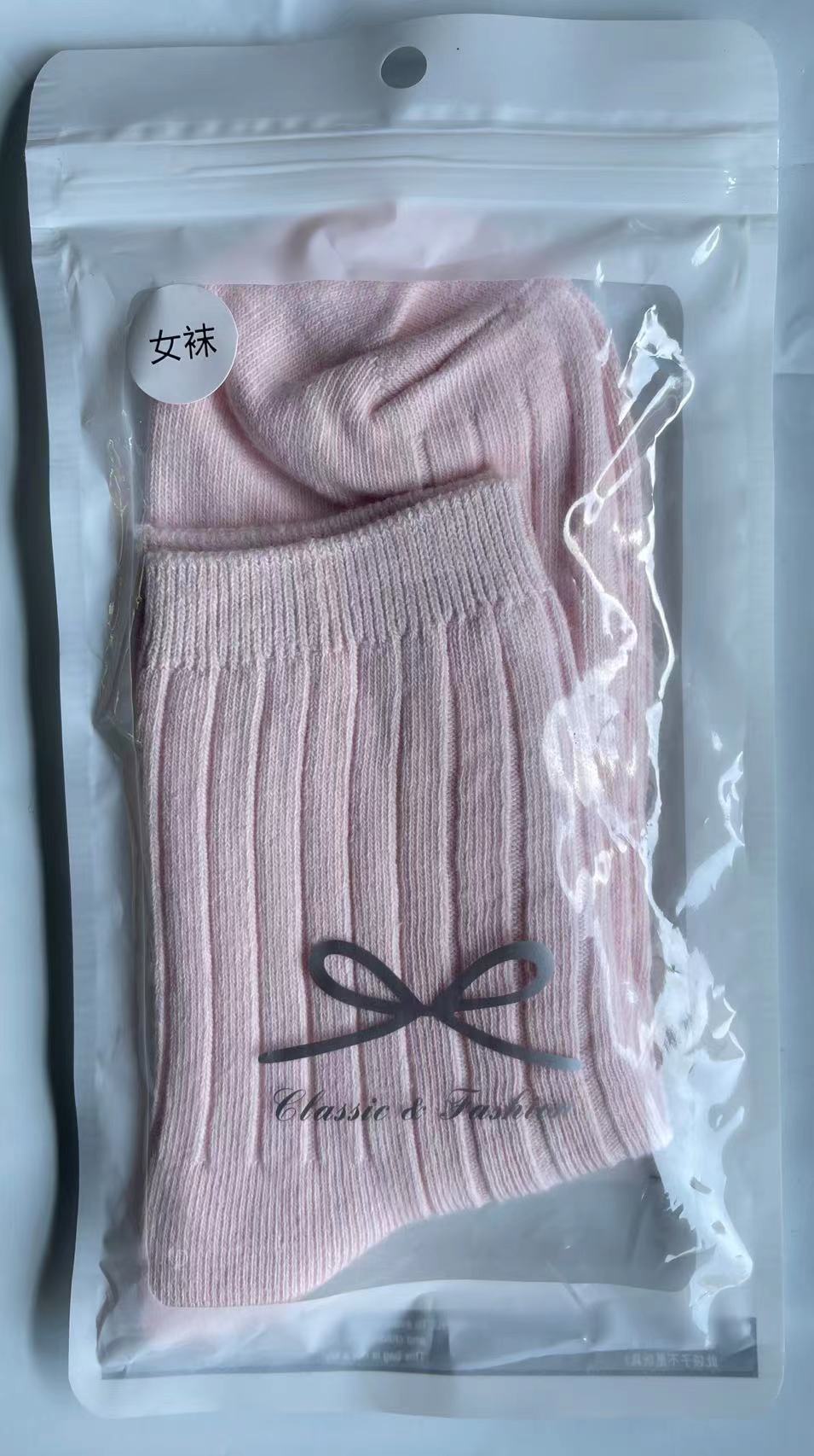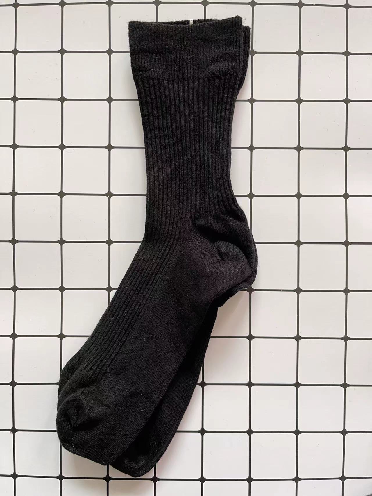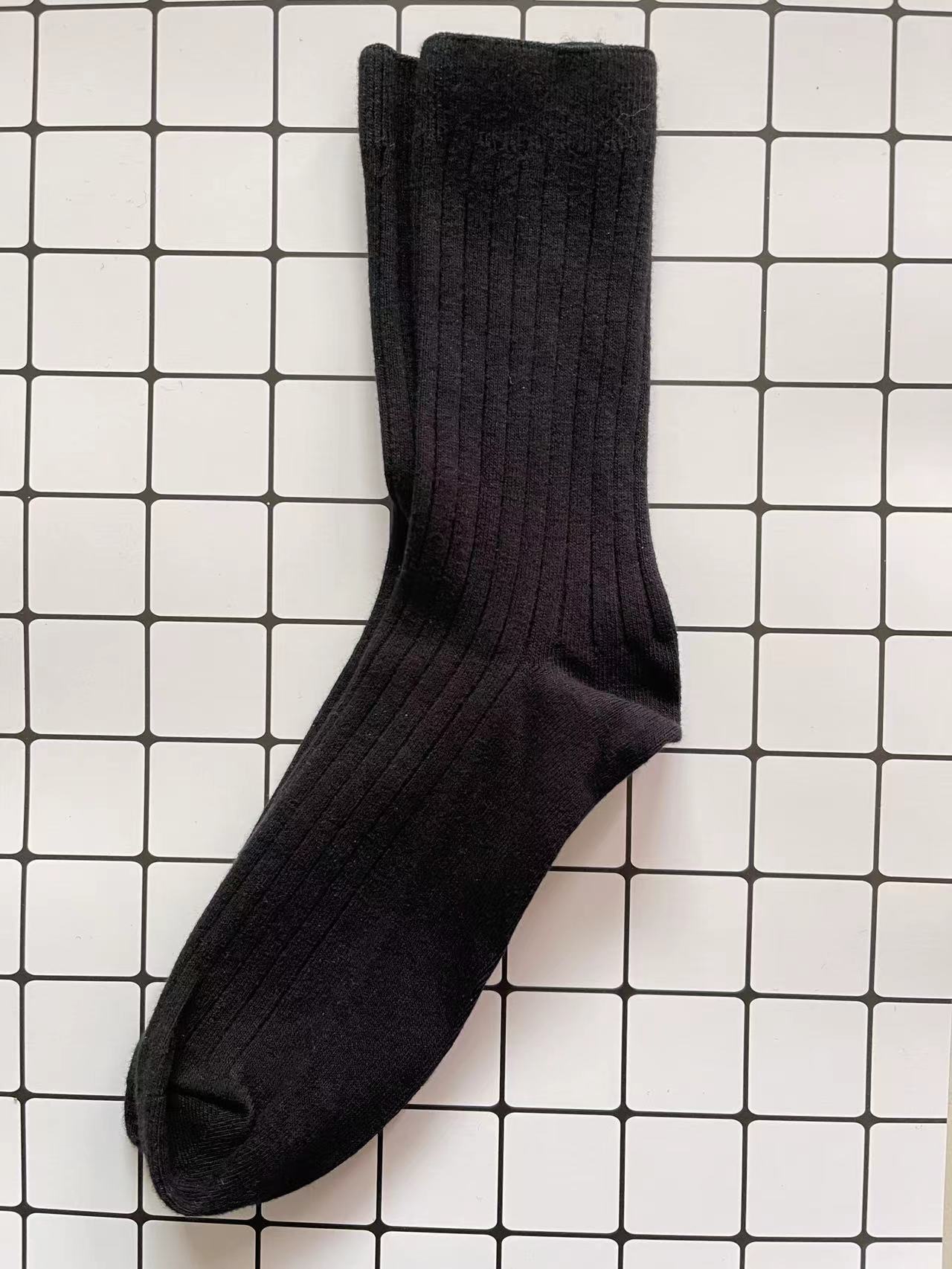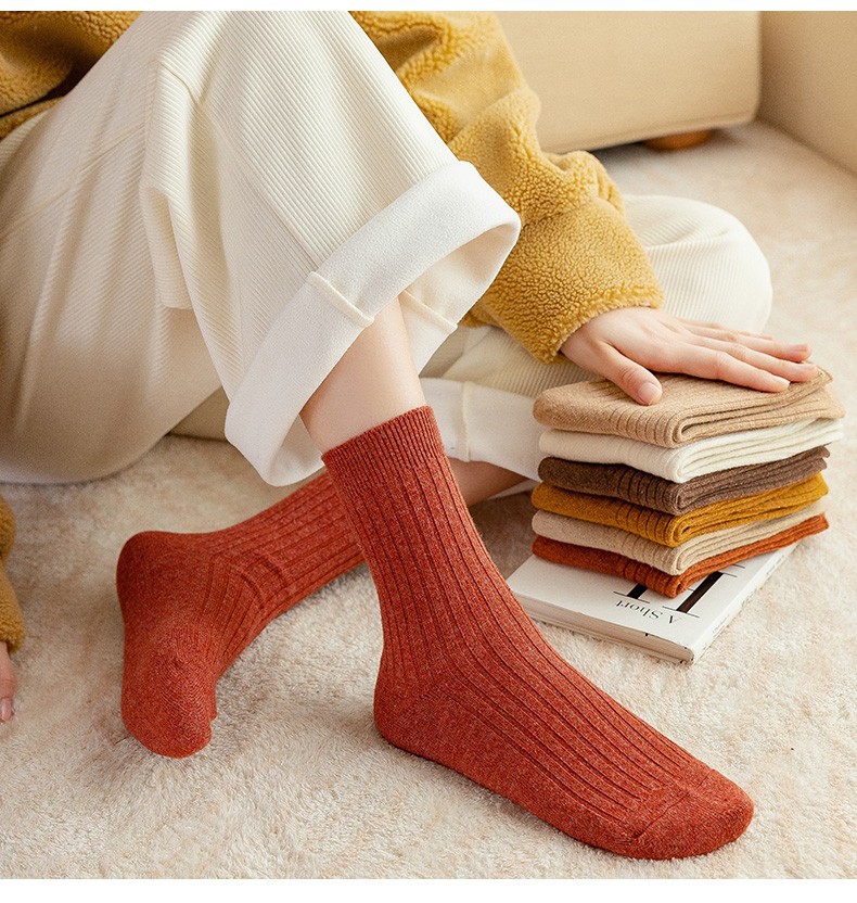袜子女秋冬款纯色棉袜混纺双针条纹中筒棉袜冬季百搭中长筒厚袜子