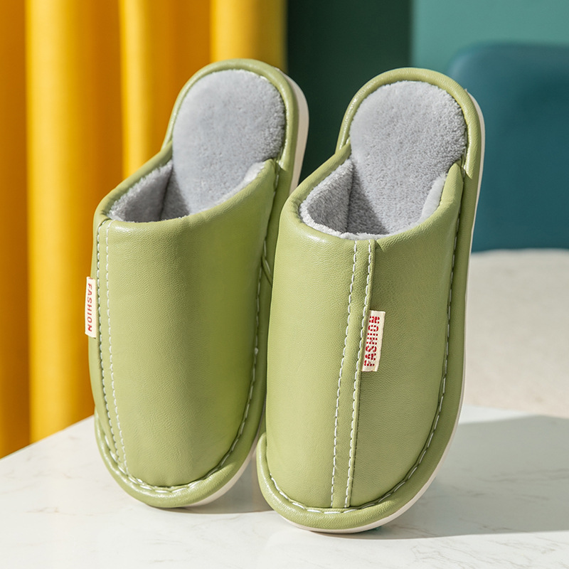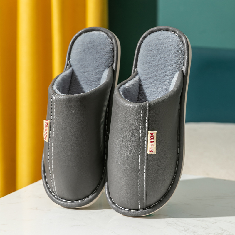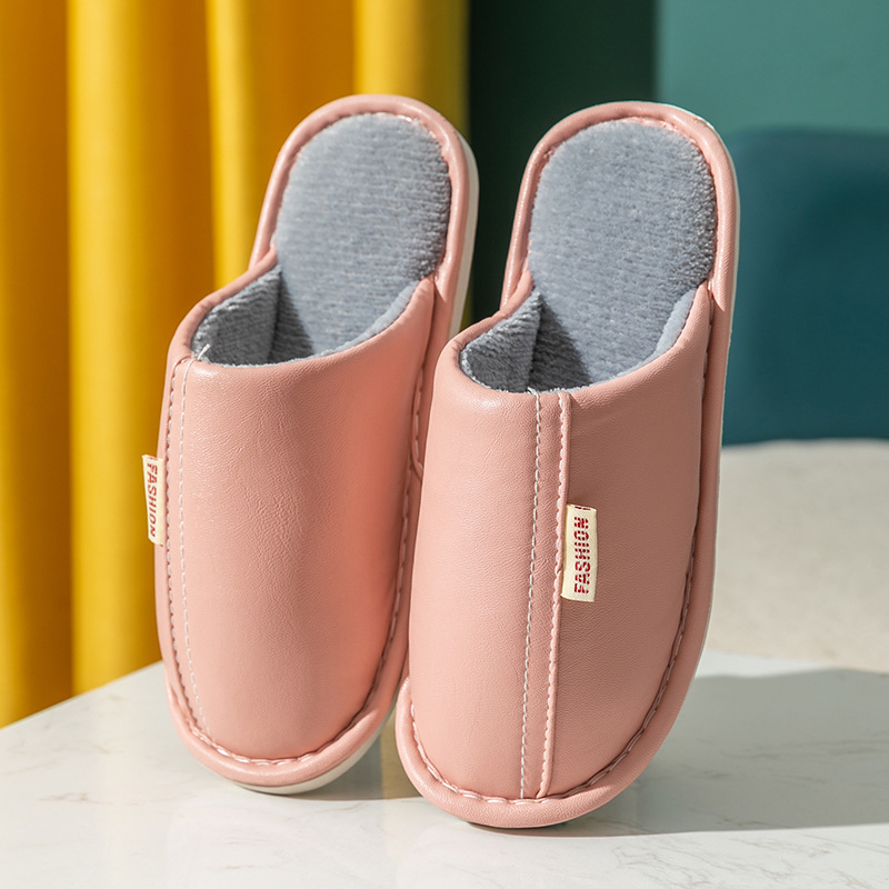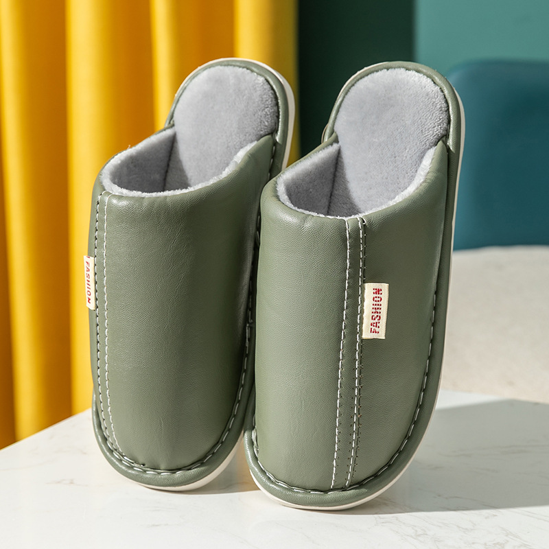 防水棉拖鞋女秋冬季居家室内PU皮拖鞋厚底保暖情侣家用防滑拖鞋男
