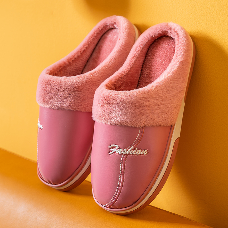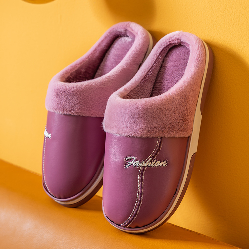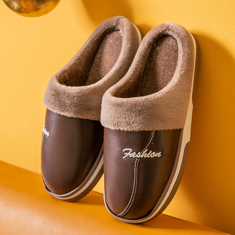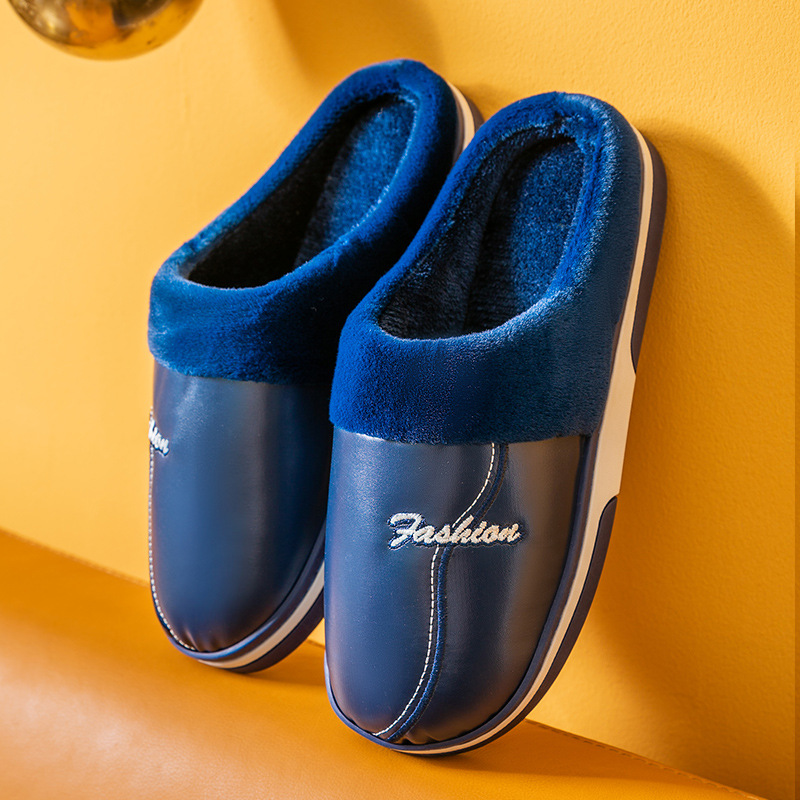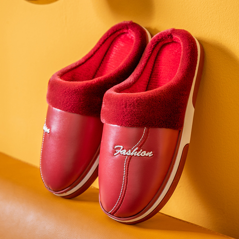 2022款棉拖鞋女秋冬季情侣家居保暖托鞋PU皮质简约厚底月子拖鞋男