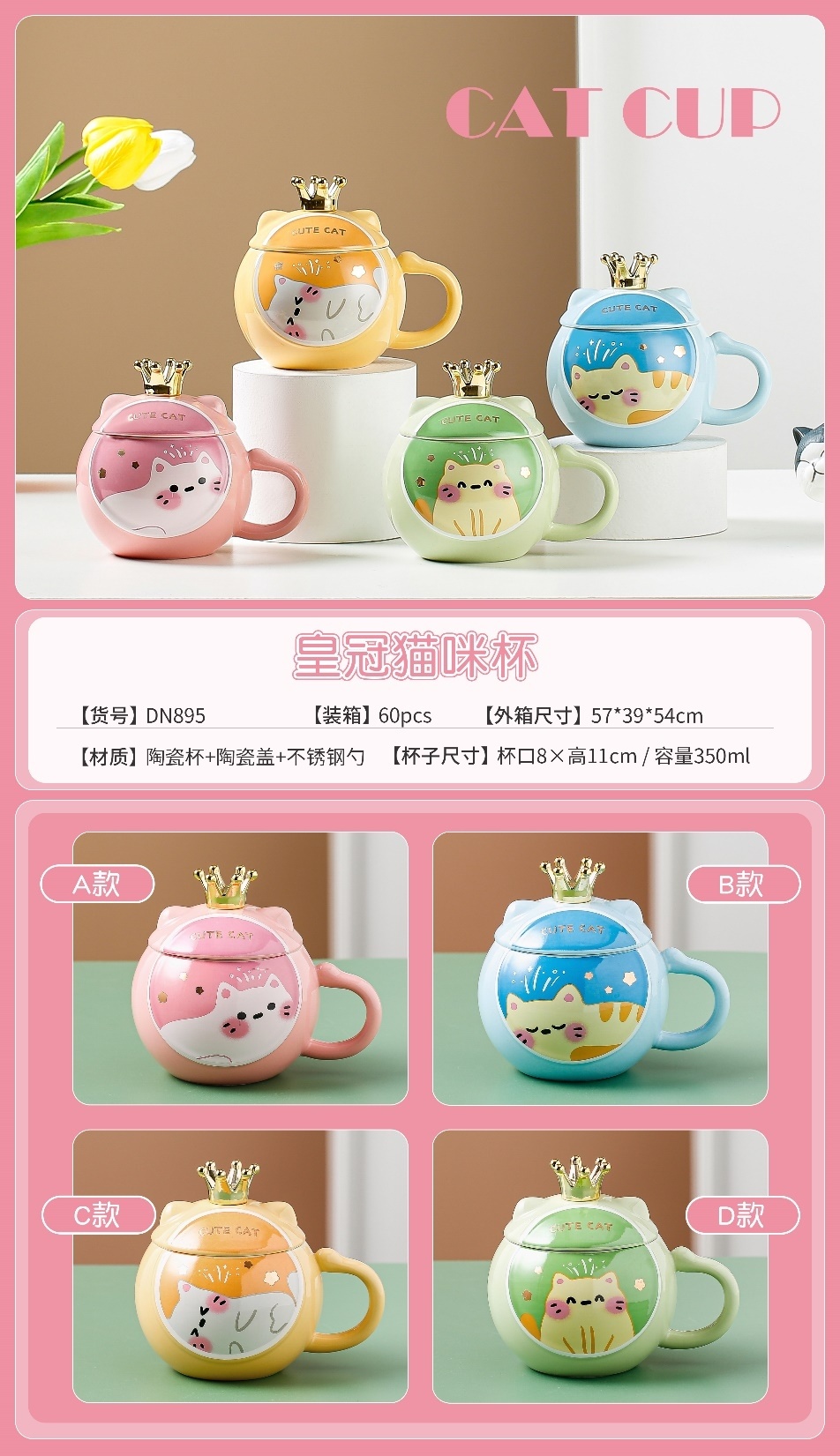 创意皇冠卡通猫咪陶瓷杯马克杯办公室咖啡杯家用早餐牛奶杯可定制