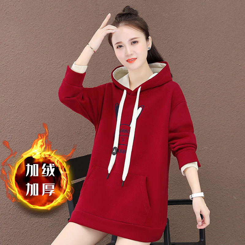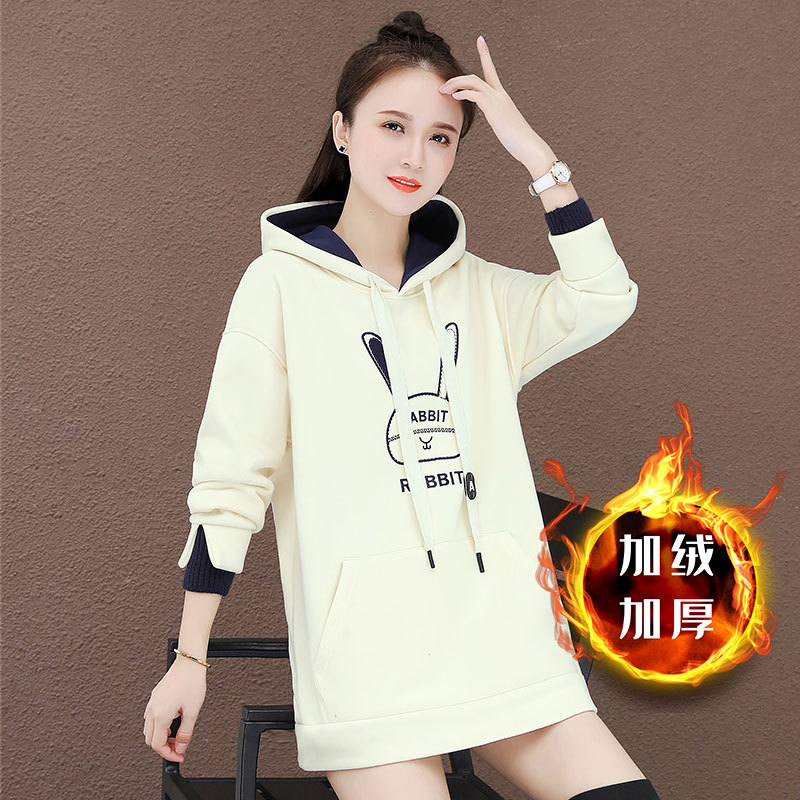 连帽中长款加绒卫衣女上衣秋冬2022新款刺绣卡通减龄宽松超厚外衣