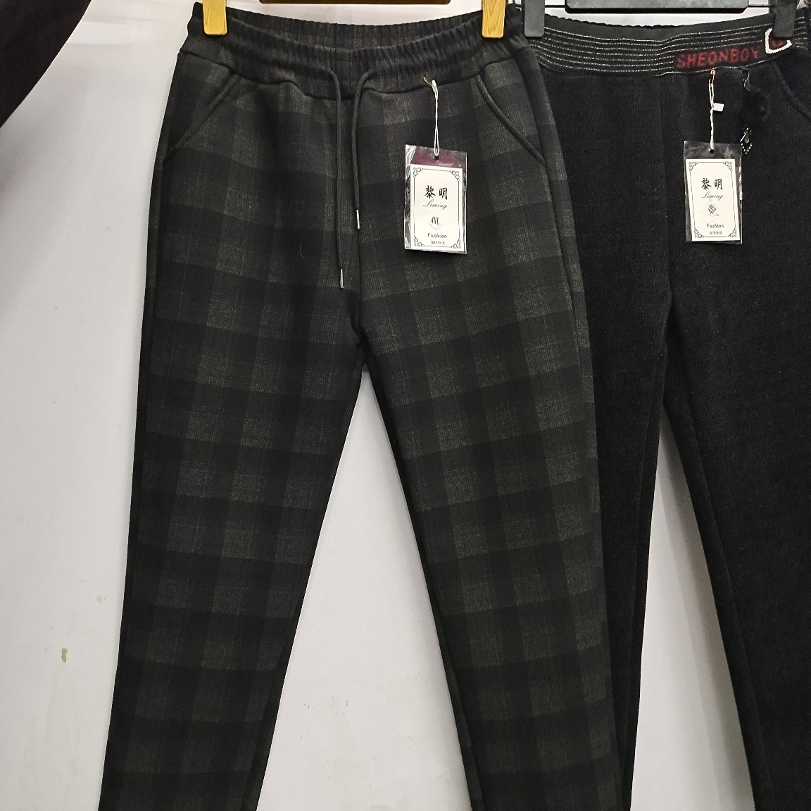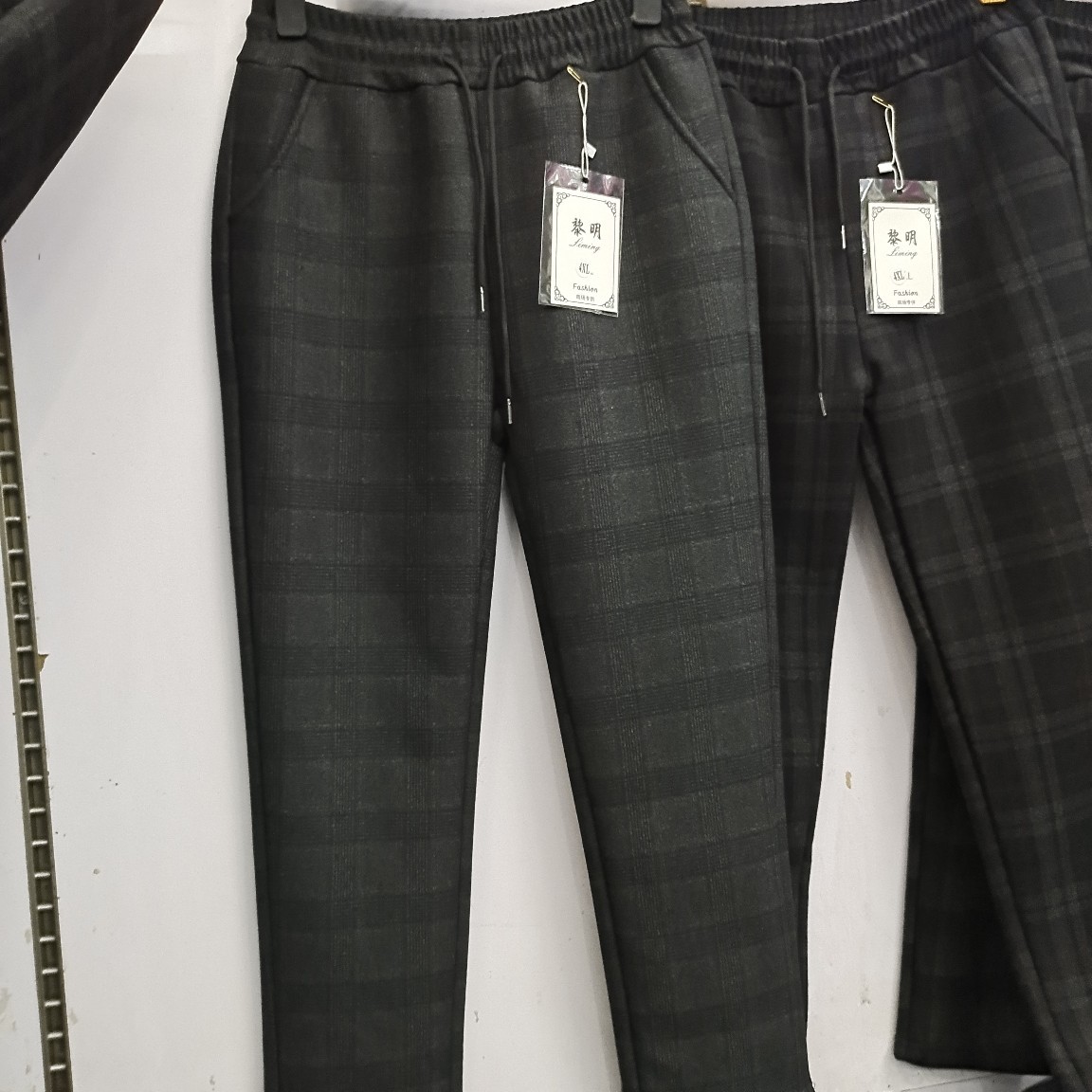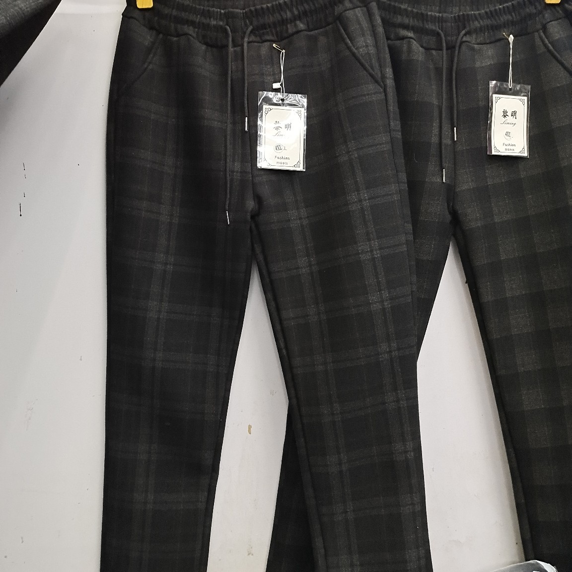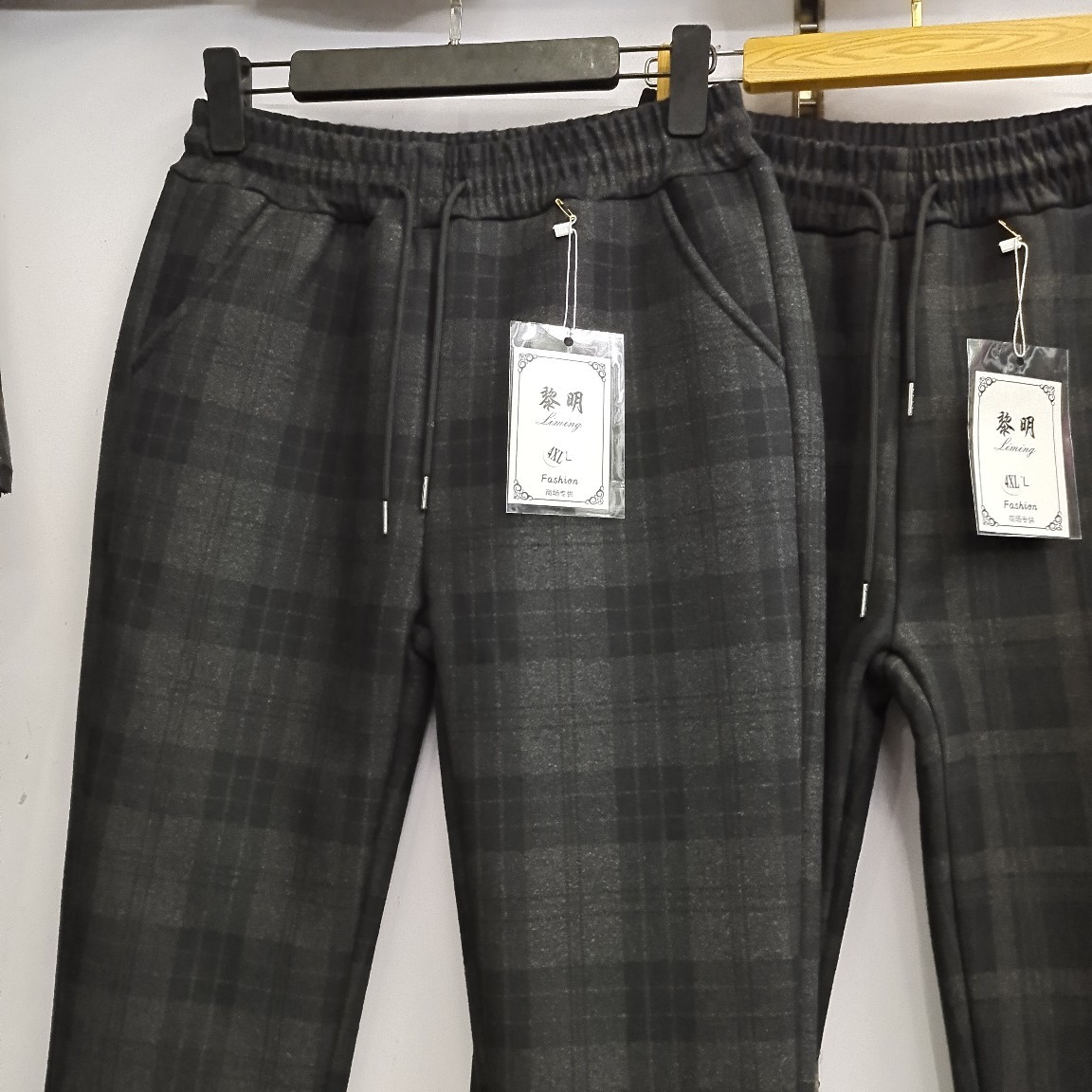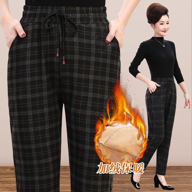 加绒加厚细绒中老年休闲裤大码格子长裤女冬外穿直筒宽松弹力口袋