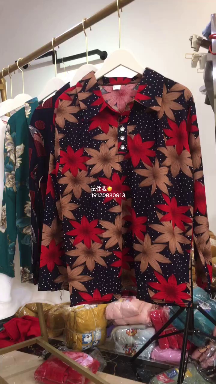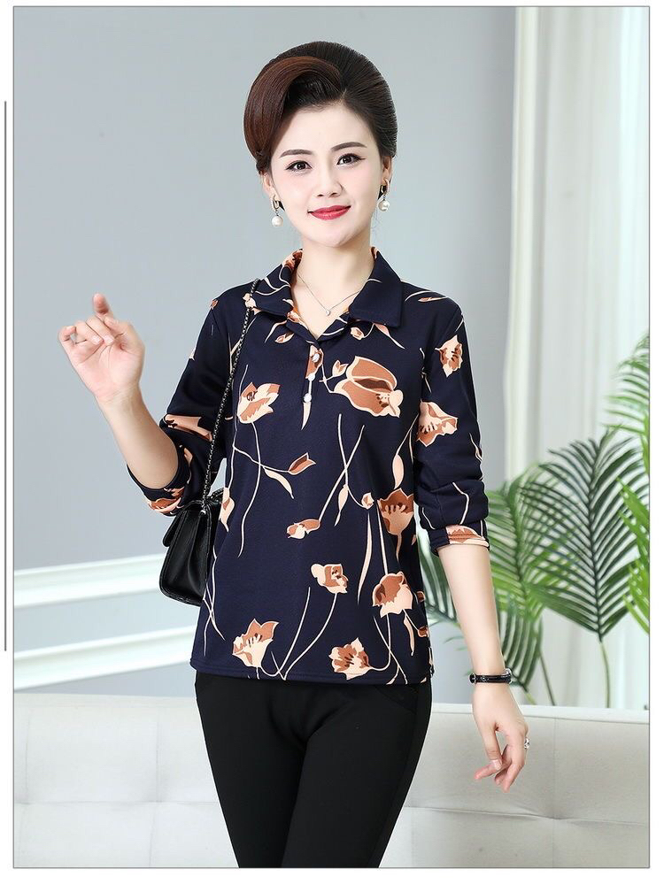 中老年女装妈妈春秋长袖T恤中老年衣服打底衫翻领国风碎花上衣