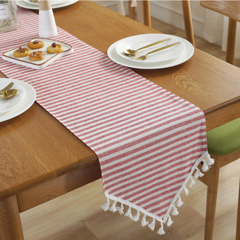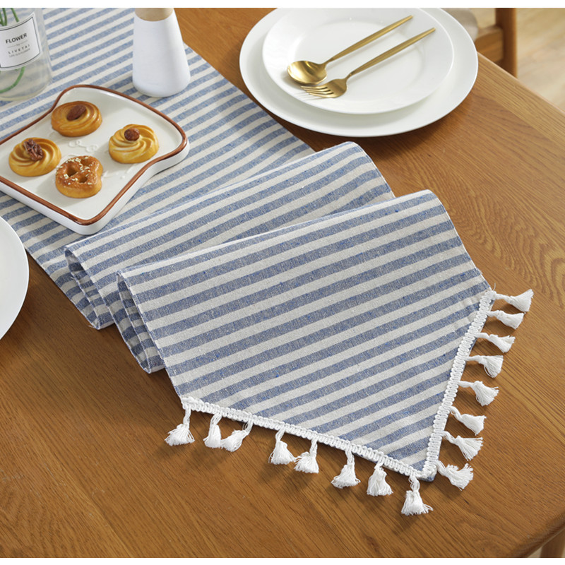 条纹流苏桌旗 棉麻桌巾 简约美式桌旗 圣诞装饰桌旗茶席一件代发