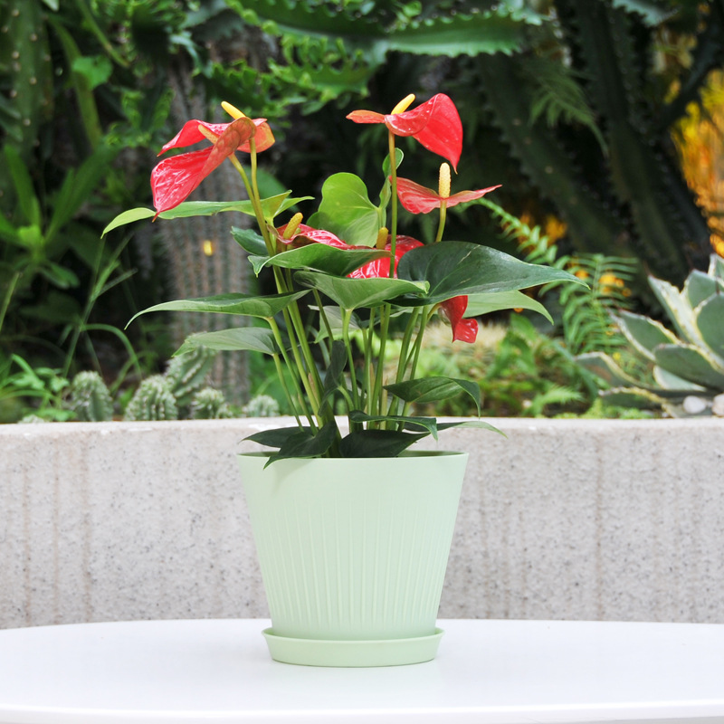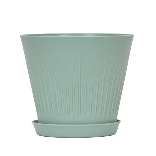 厂家直供亚马逊圆口束腰条纹彩色磨砂带托盘塑料花盆室内桌面盆