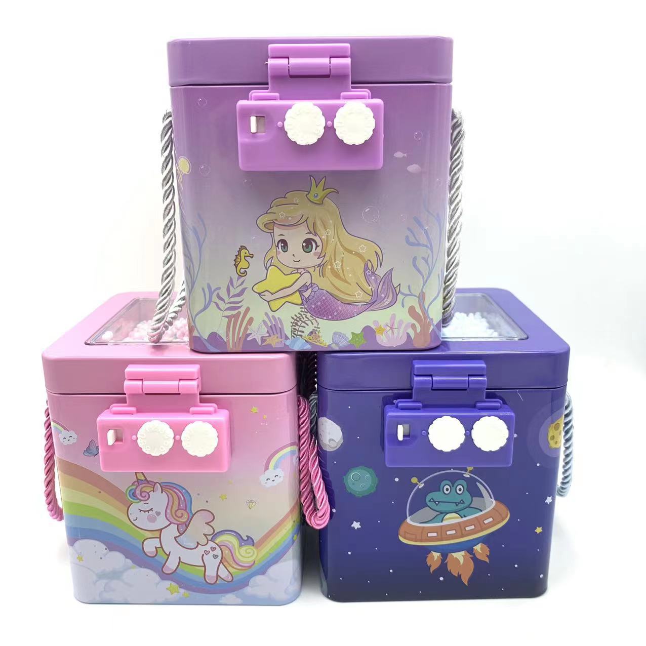 卡通手提方形密码锁储钱罐独角兽美人鱼恐龙流沙存钱罐手提礼品罐