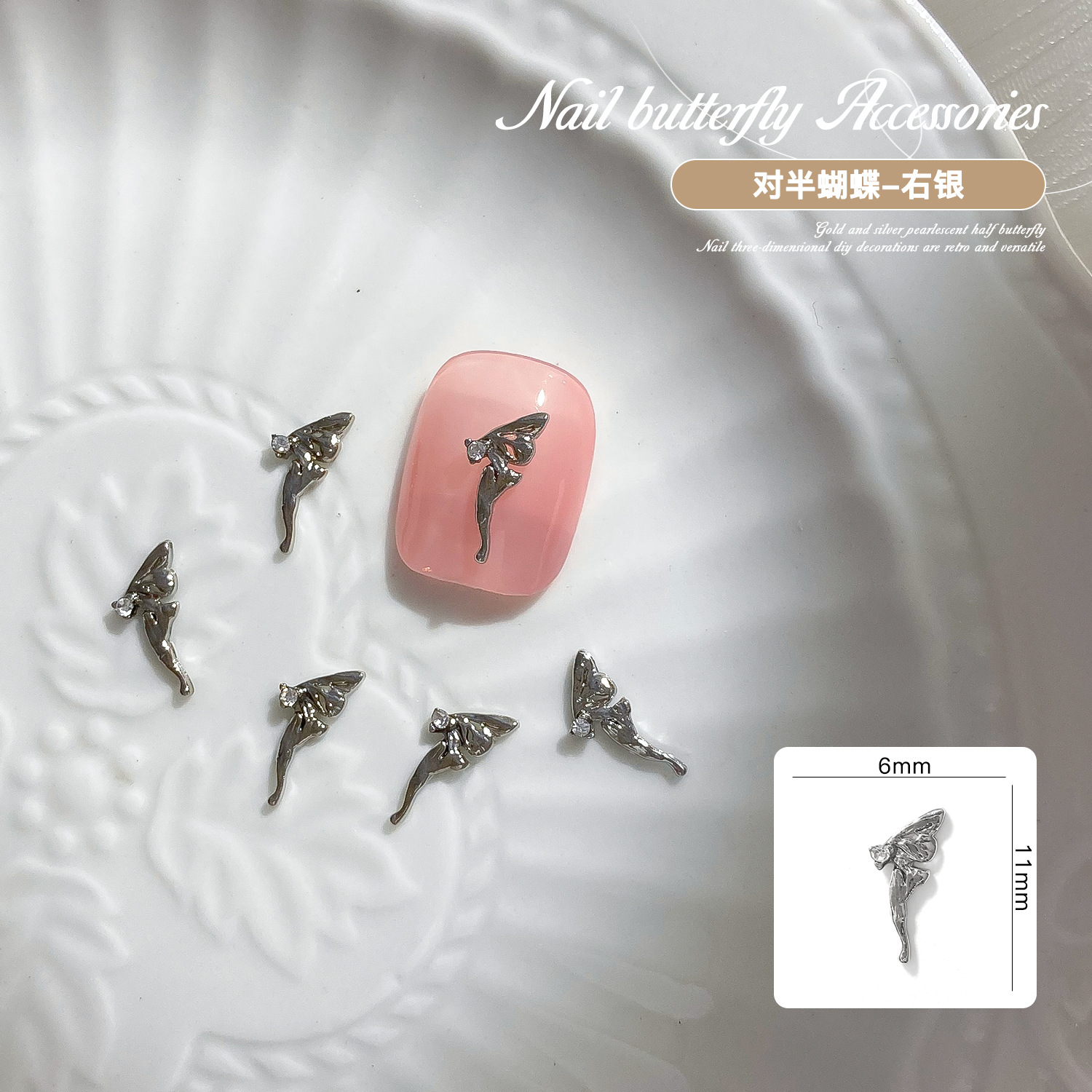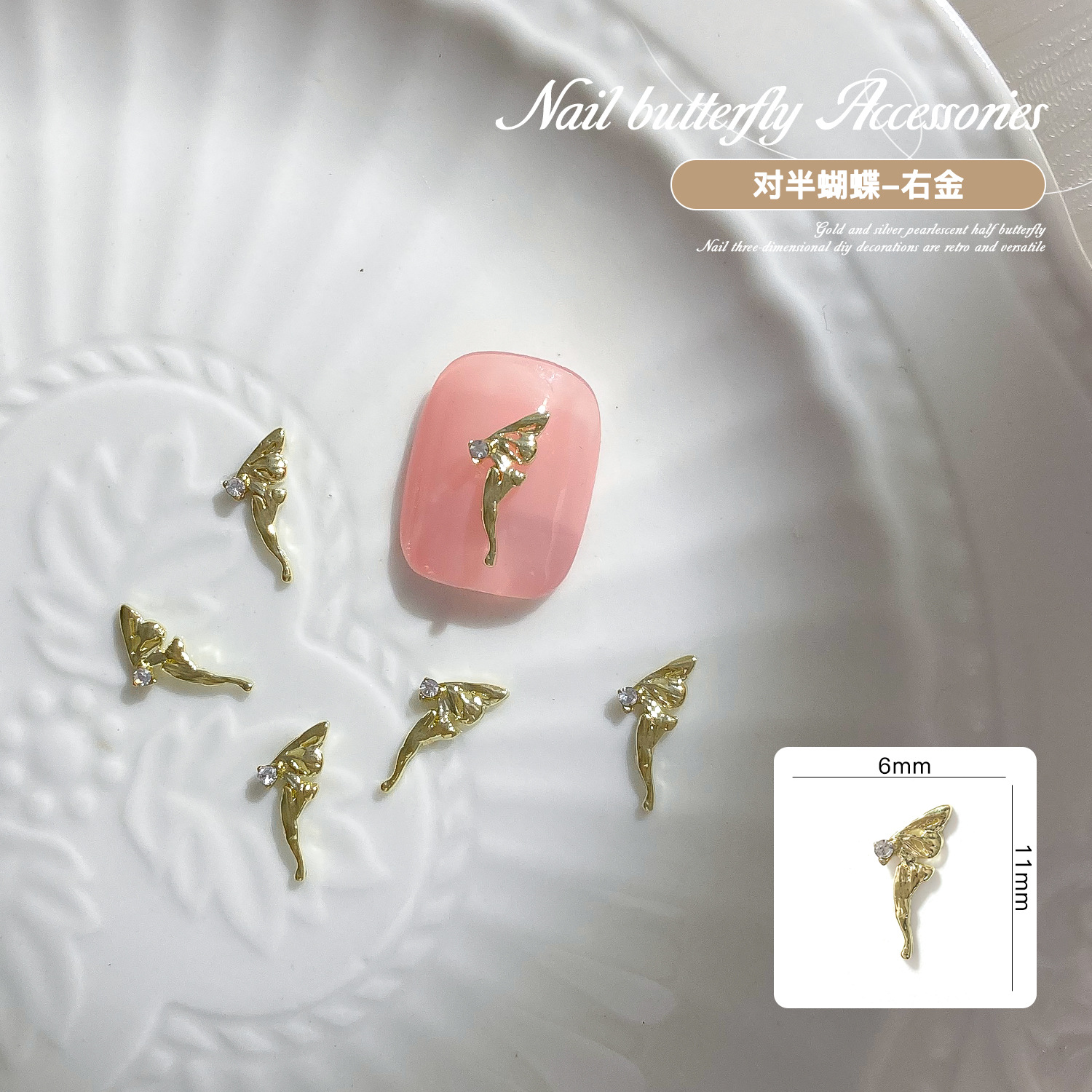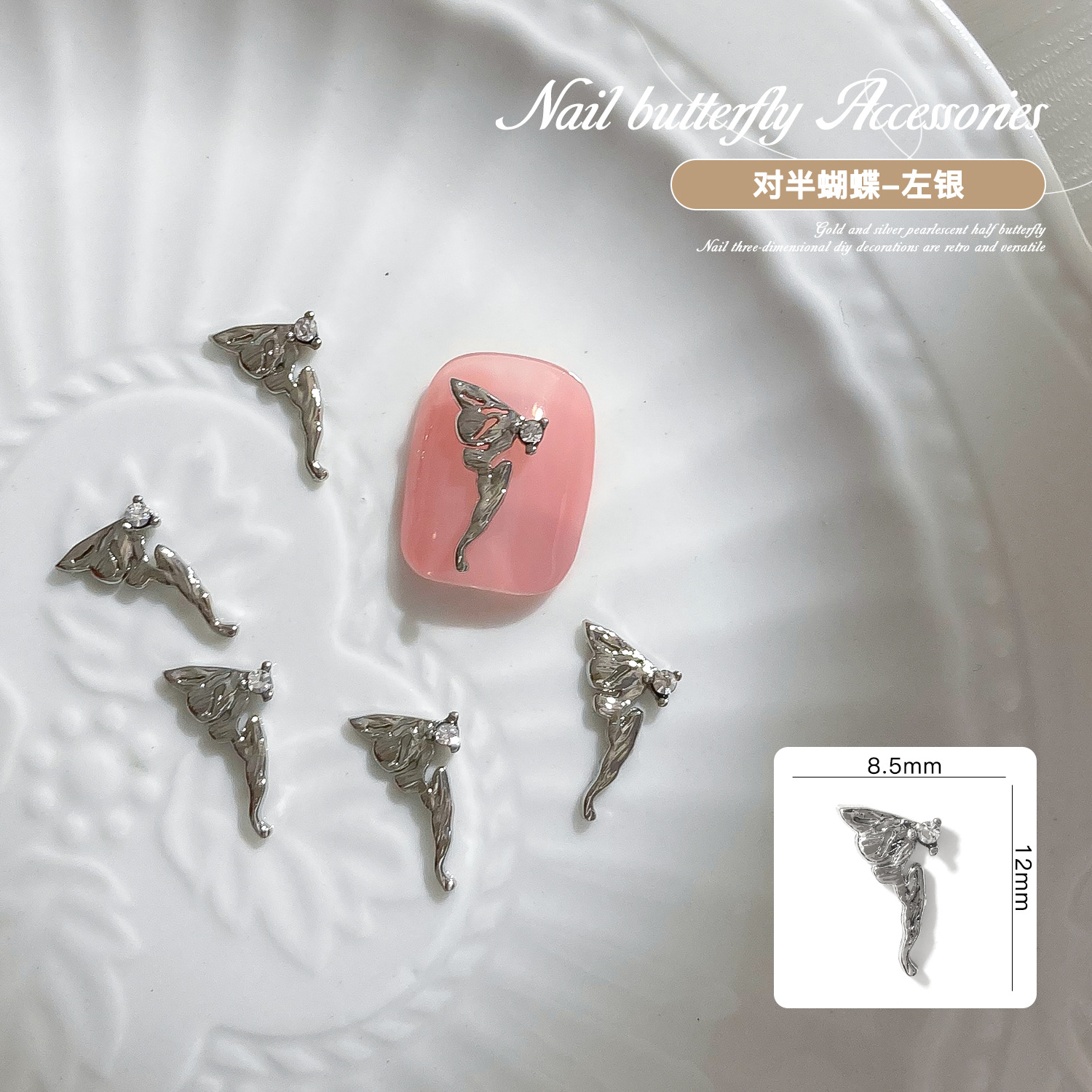 美甲对半珠光蝴蝶立体白色钻金属金银指甲diy小饰品