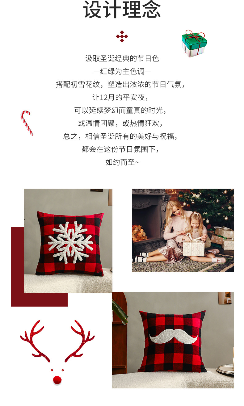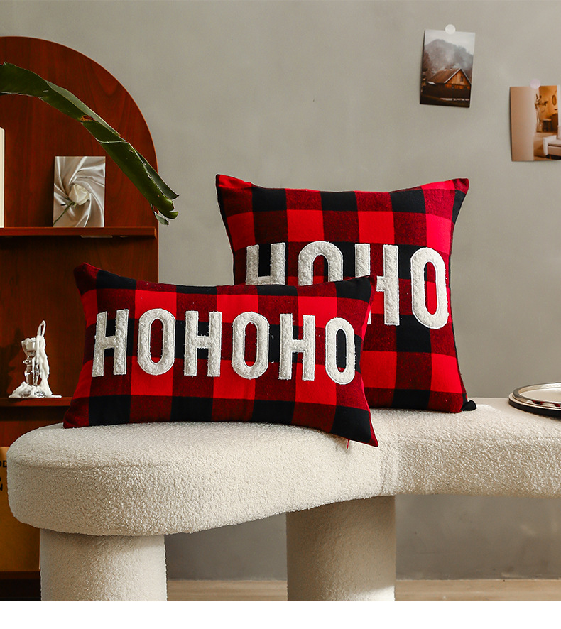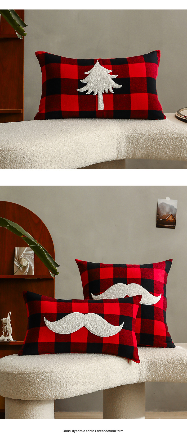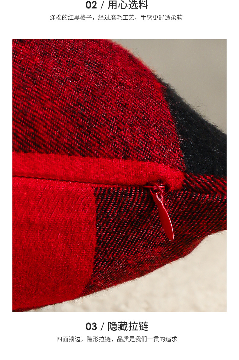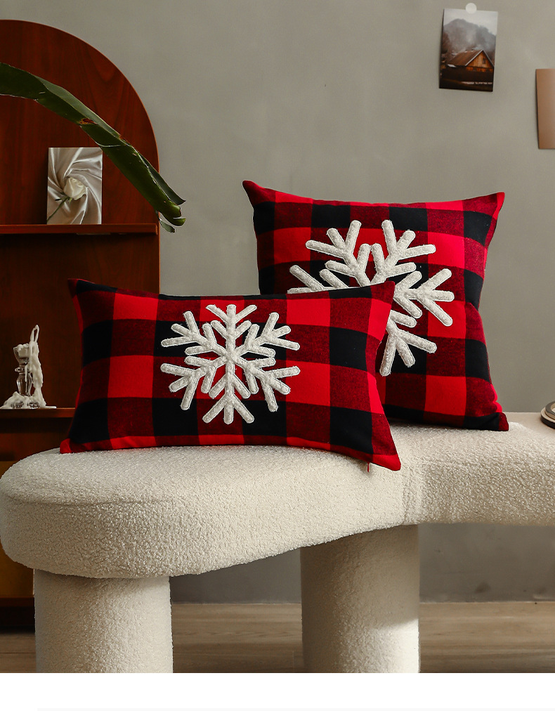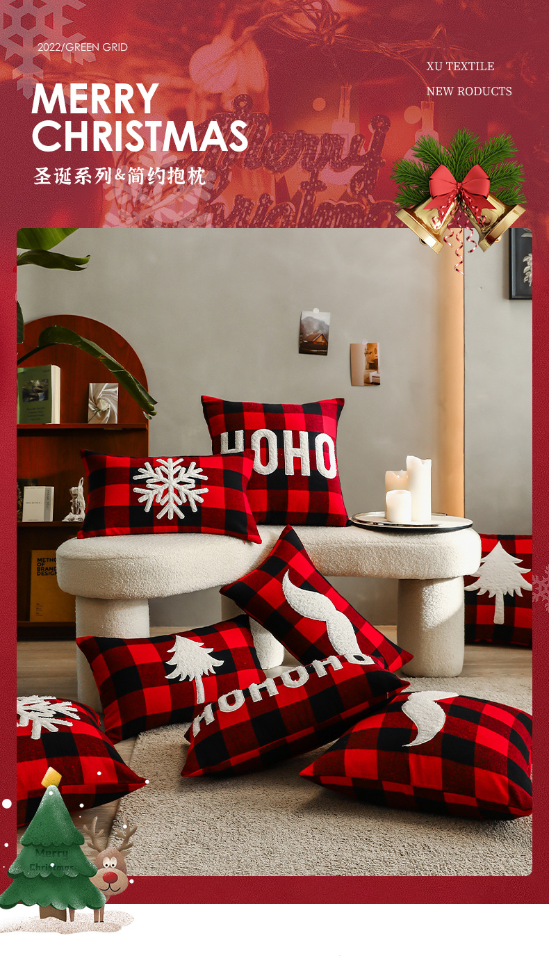 圣诞红黑格子刺绣抱枕靠枕靠垫套圣诞风格卧室客厅抱枕不含芯