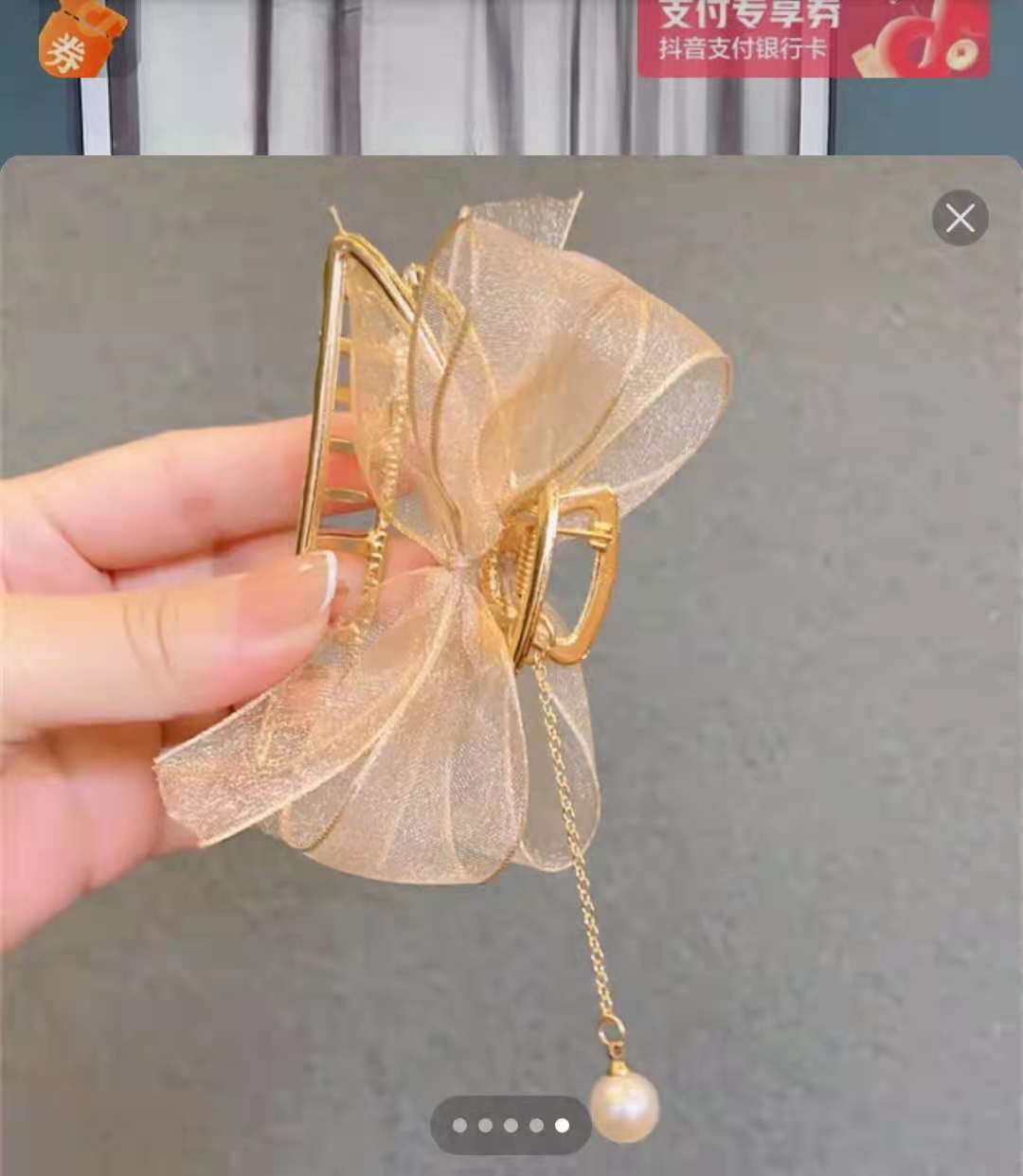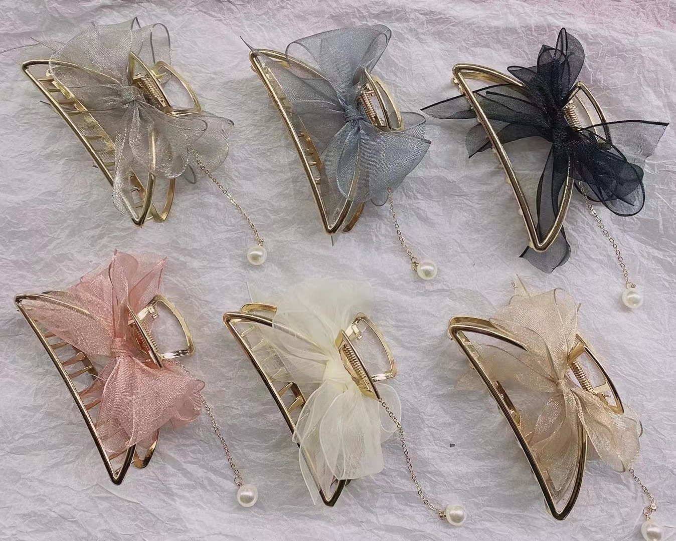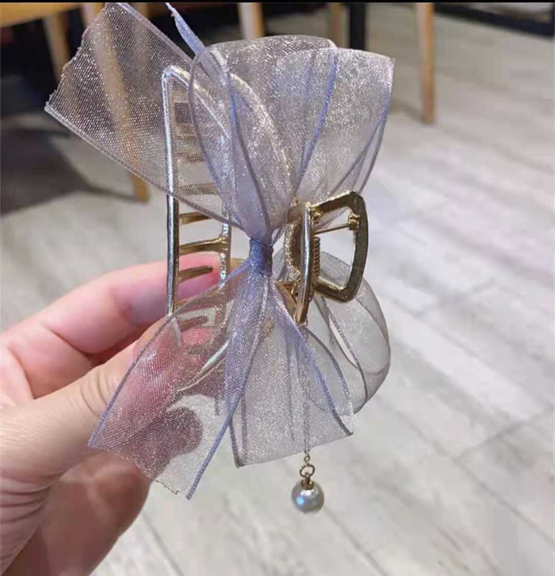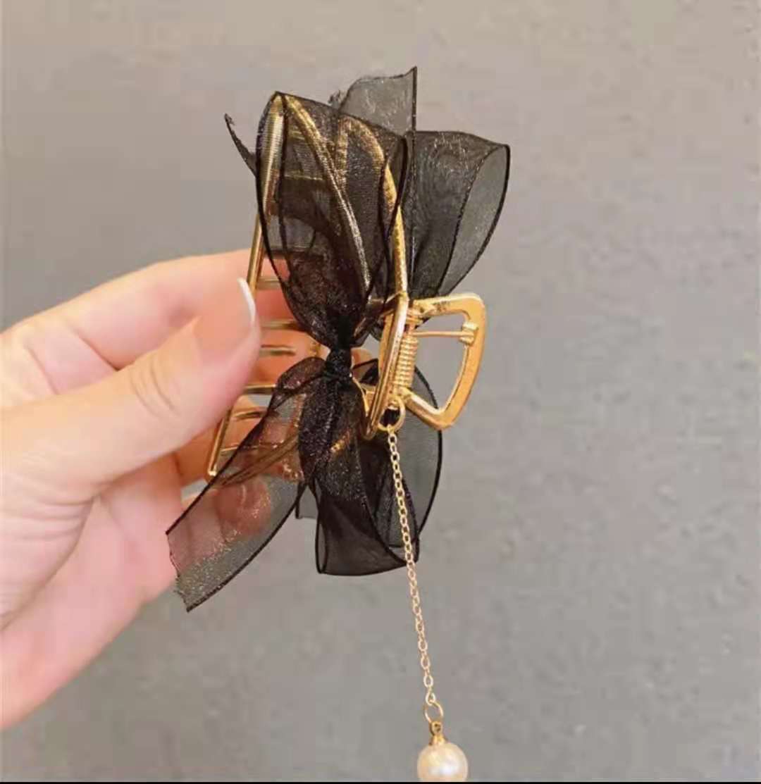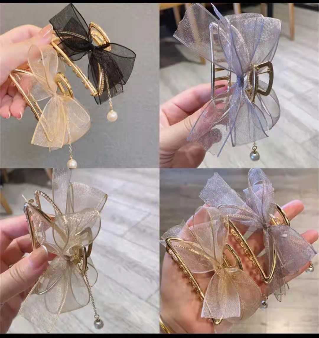 春夏新款网纱蝴蝶结珍珠吊坠抓夹发夹简约韩式盘发丸子头鲨鱼夹