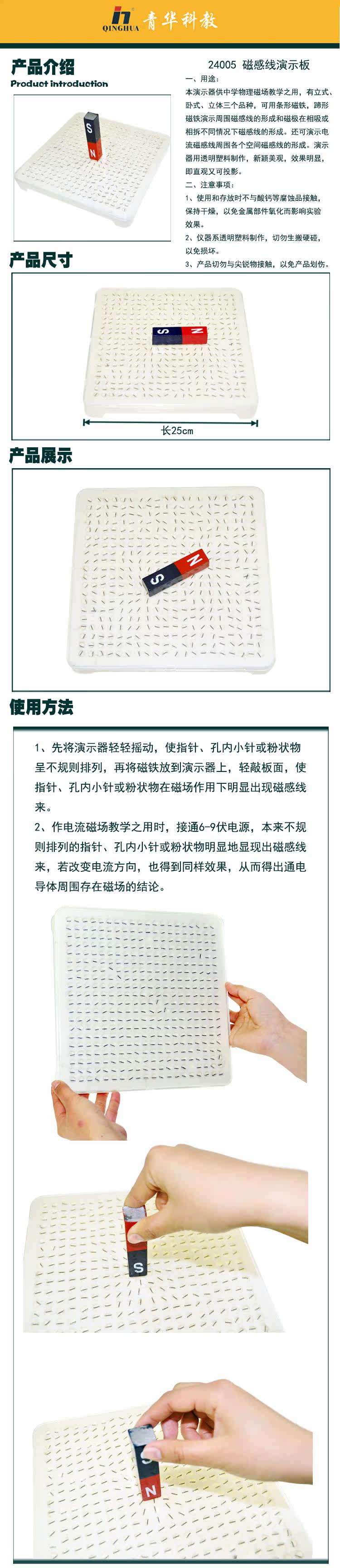 本演示器供中学物理磁场教学之用,有立式、卧式、立体五个品种,可用条形磁铁,蹄形磁铁演示周围磁感线的形成和磁在相吸或相斥不同情况下磁感线的形成。还可演示电流磁场周围各个空间磁感线的形成。本演示器用有机玻璃制作,新颖美观,效果明显,既直观又可投影。