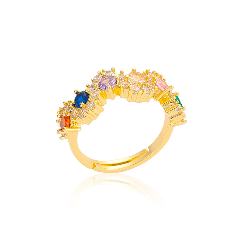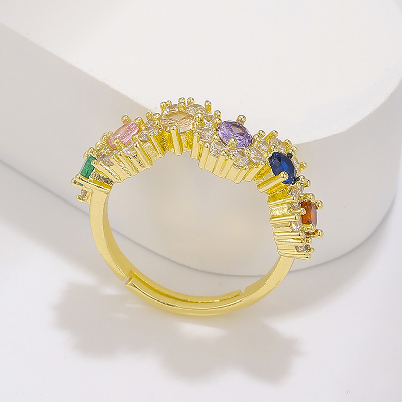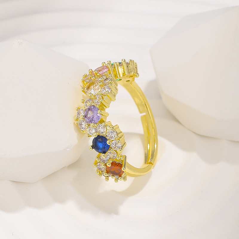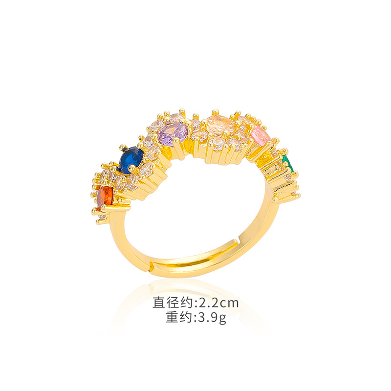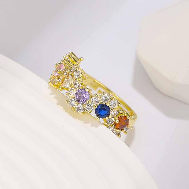 欧美时尚热卖清新皇冠彩色宝石戒指黄铜镀金微镶锆石大气开口戒女