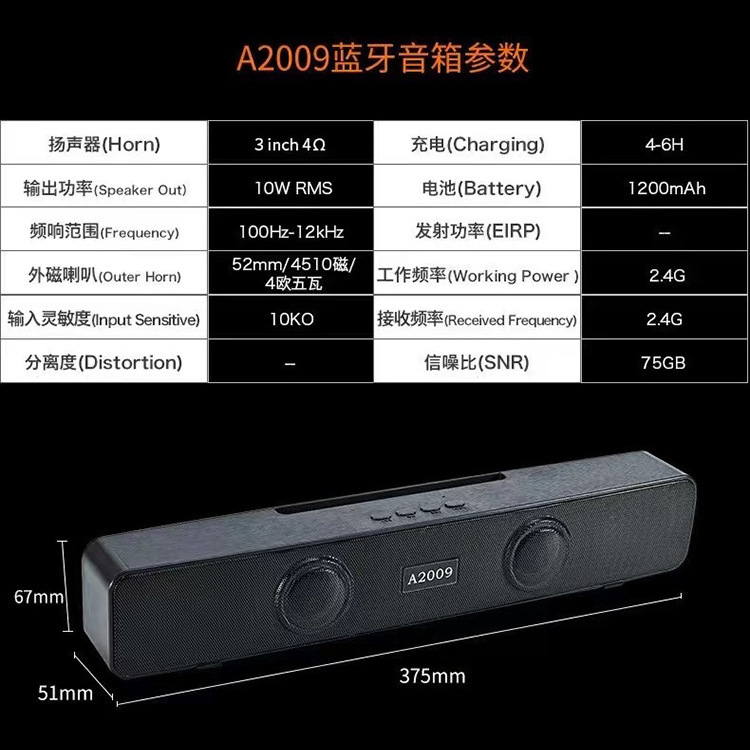 A2009台式家用桌面低音炮扬声器3D环绕蓝牙长条形带LED灯蓝牙音箱