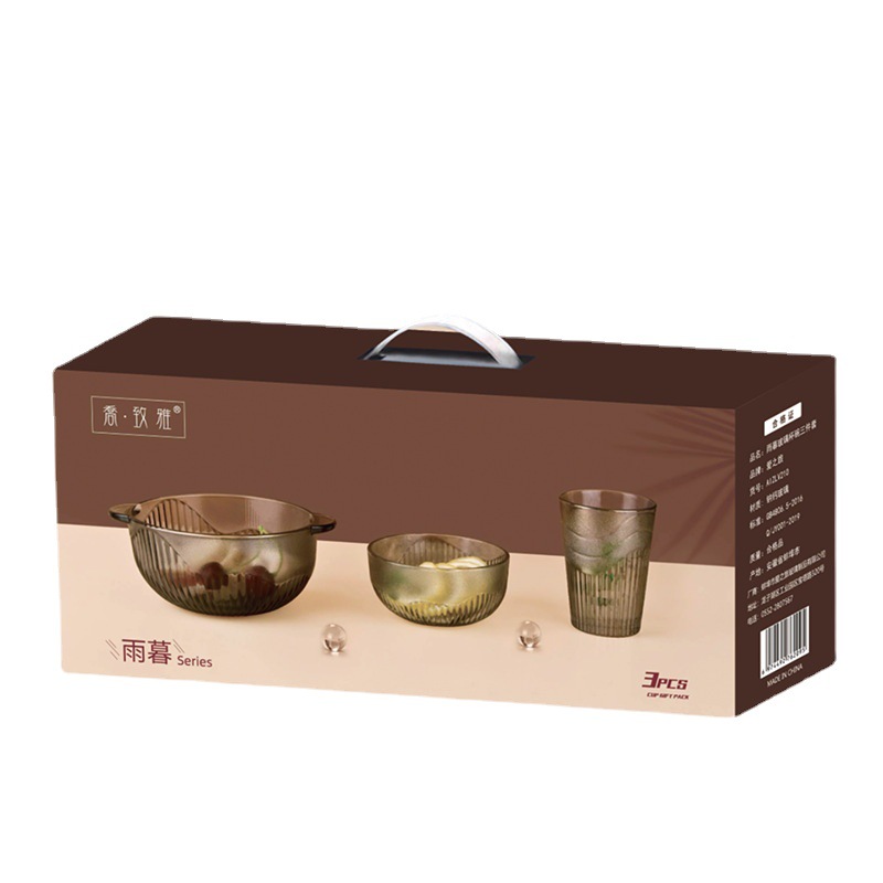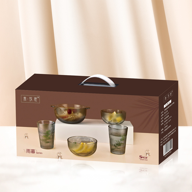 日式餐具竖纹玻璃碗套装 家用甜品双耳碗五件套 保险银行活动礼品