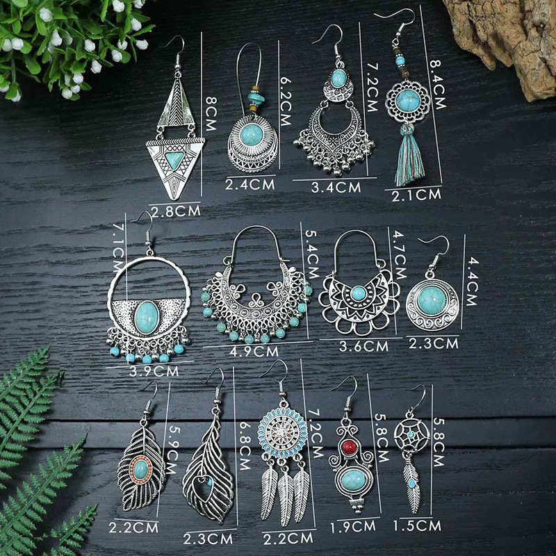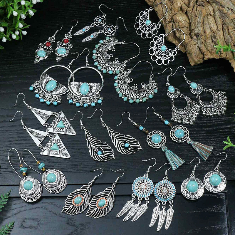 欧美时尚复古民族风镂空松石水滴耳环女 波西米亚流苏耳钉饰品批