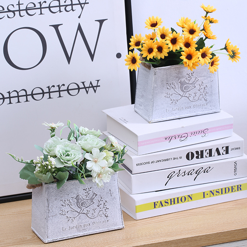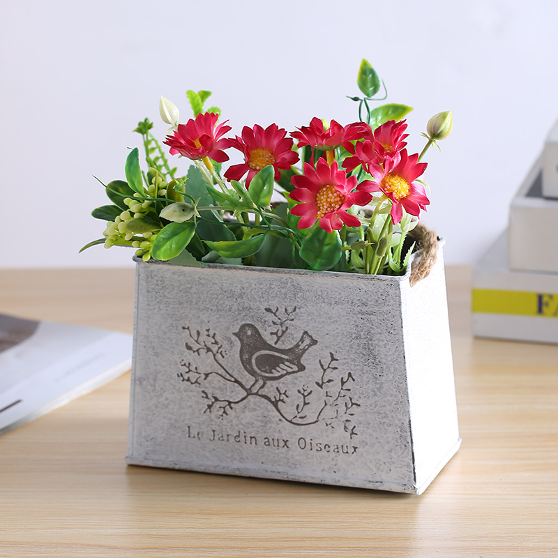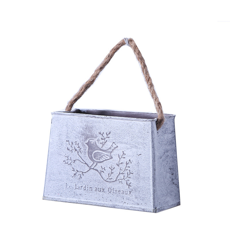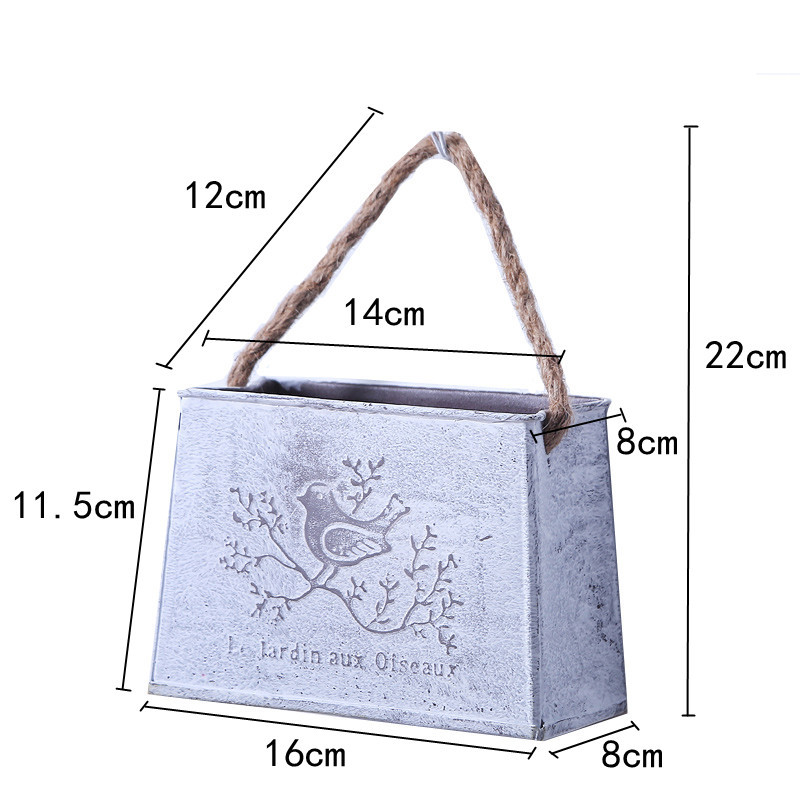 复古铁皮挂盆小鸟麻绳挂式花盆墙壁墙面装饰干花花器铁艺挂桶挂件