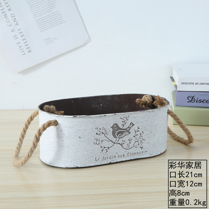 复古铁皮花盆美式风麻绳椭圆形花盆铁制金属盆多肉绿植花盆收纳盒