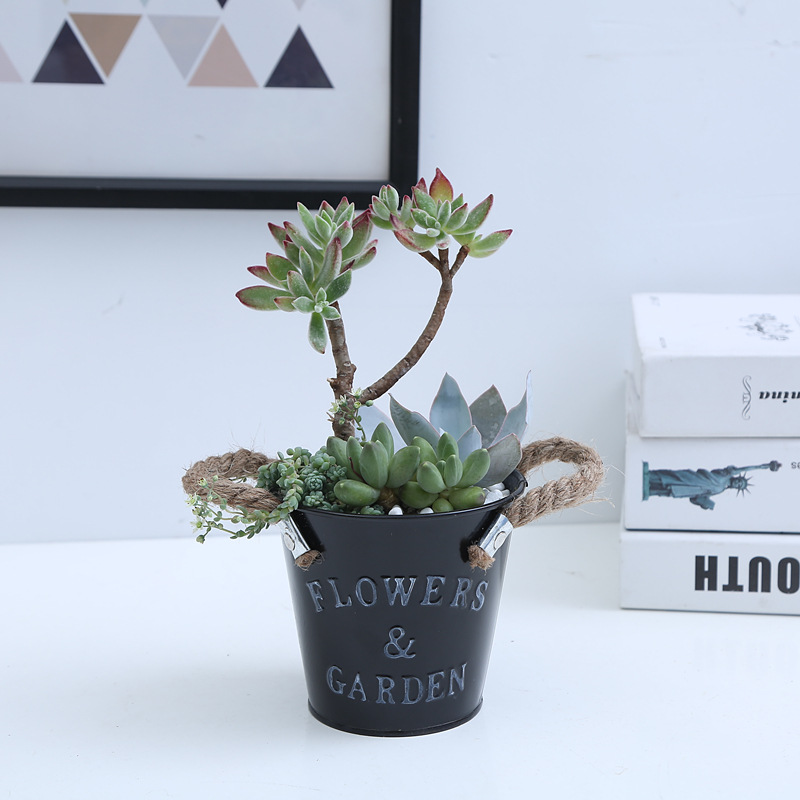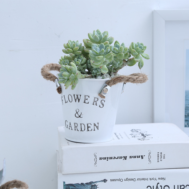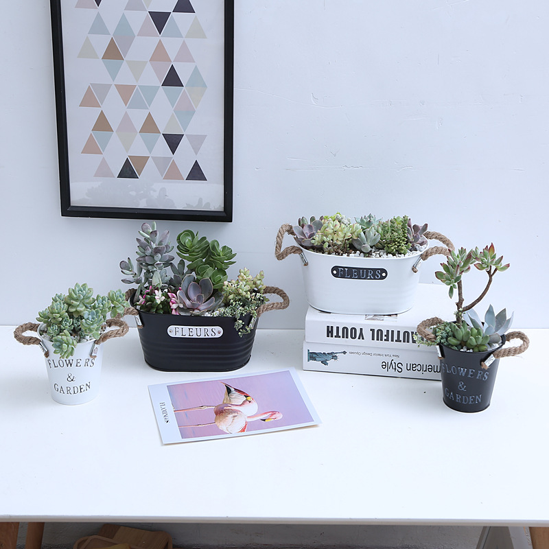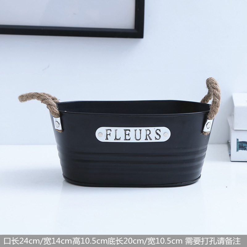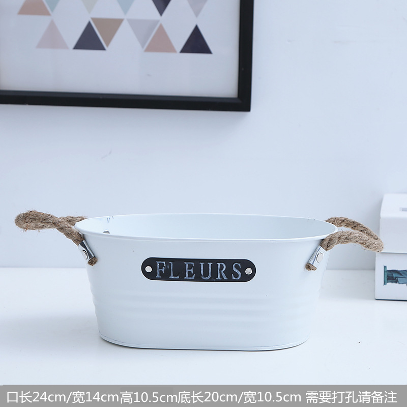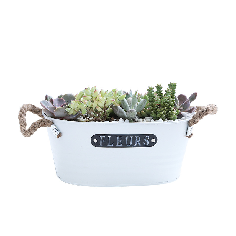 多肉植物鲜花铁皮多肉花盆椭圆形麻绳把手铁艺盆工业风简约铁花盆