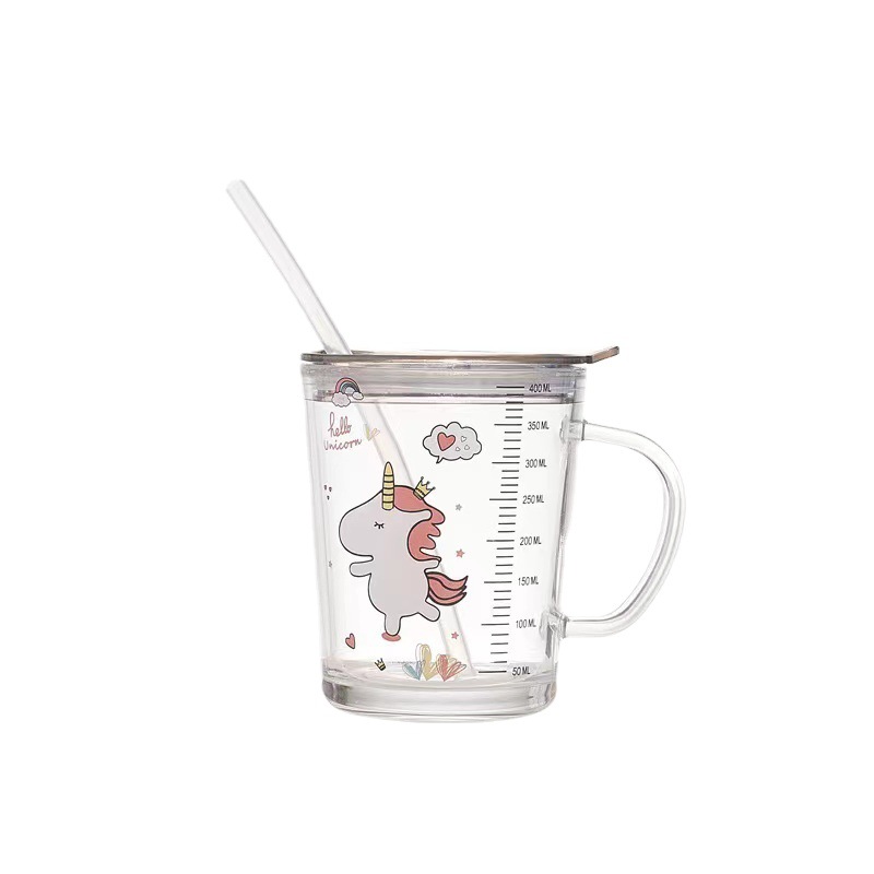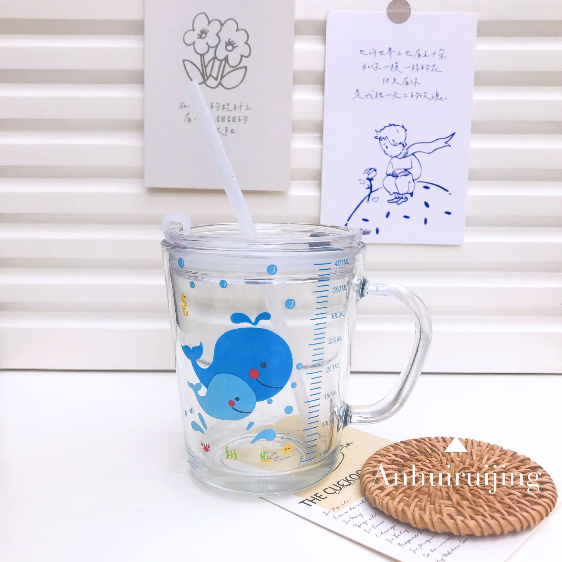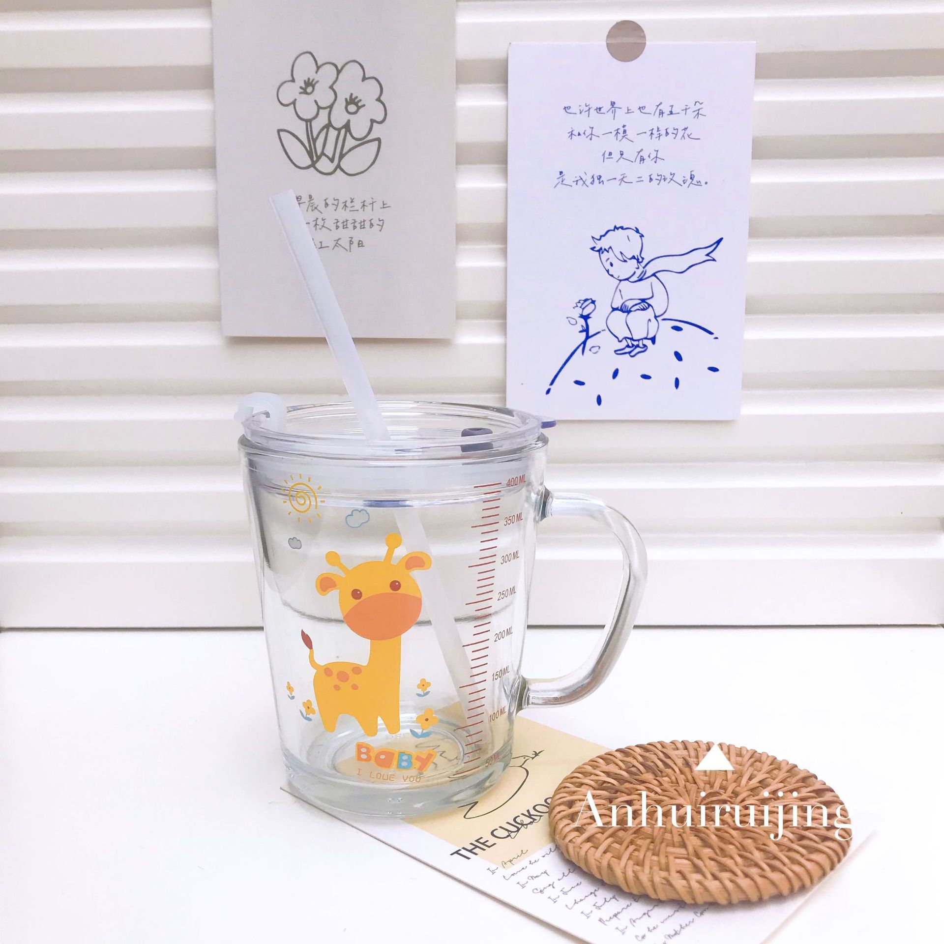 批发玻璃儿童刻度杯带盖吸管杯宝宝喝奶玻璃杯把手杯早餐杯批发