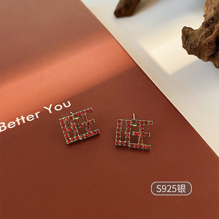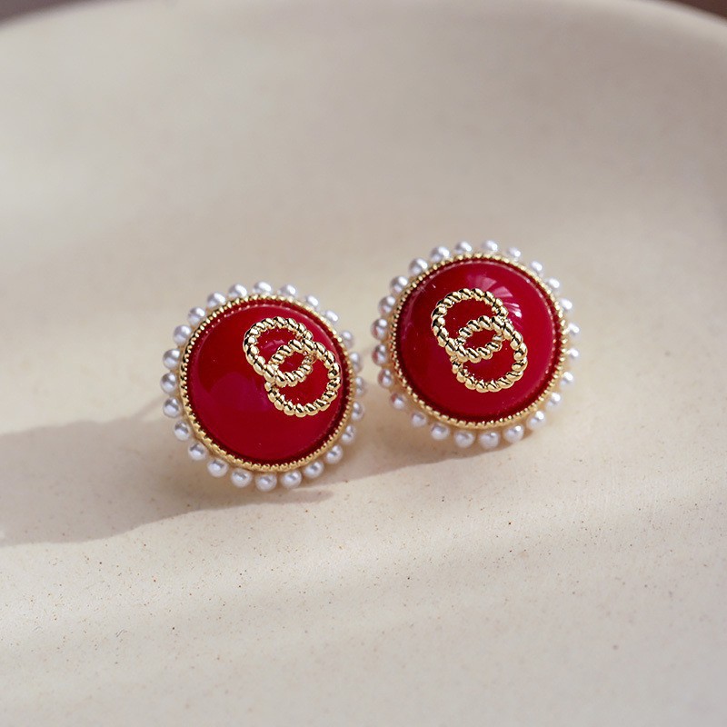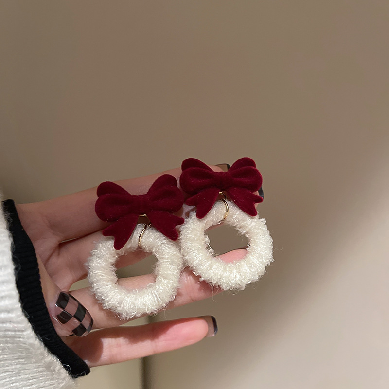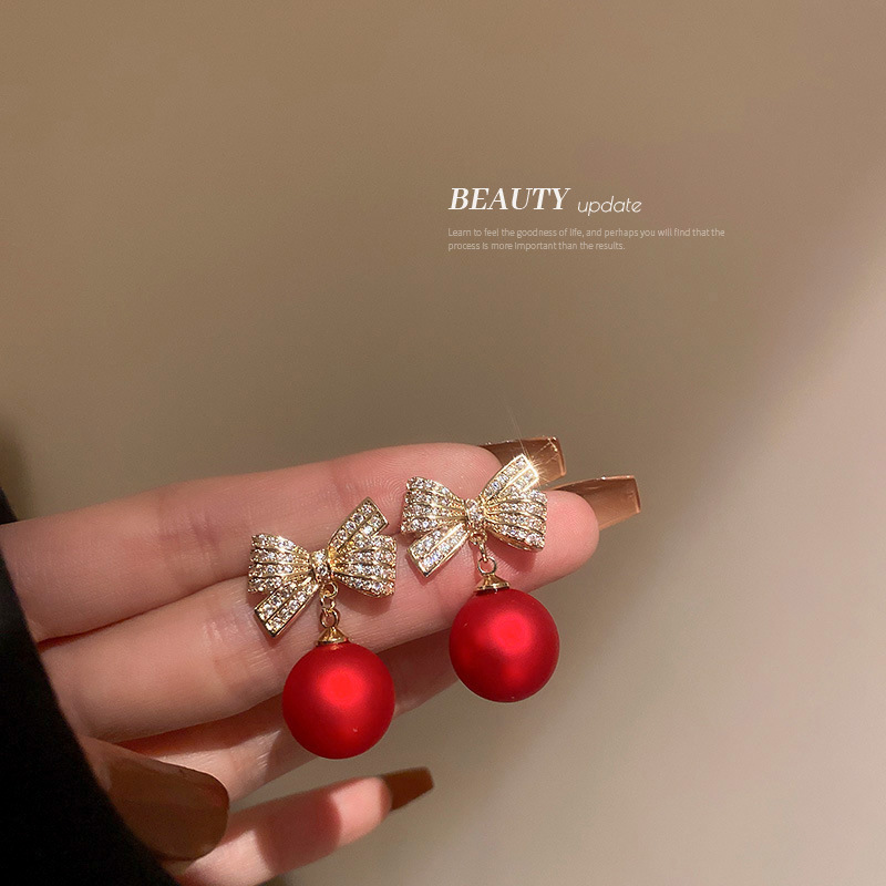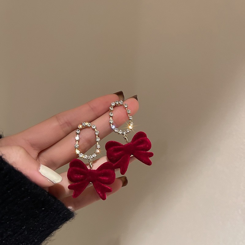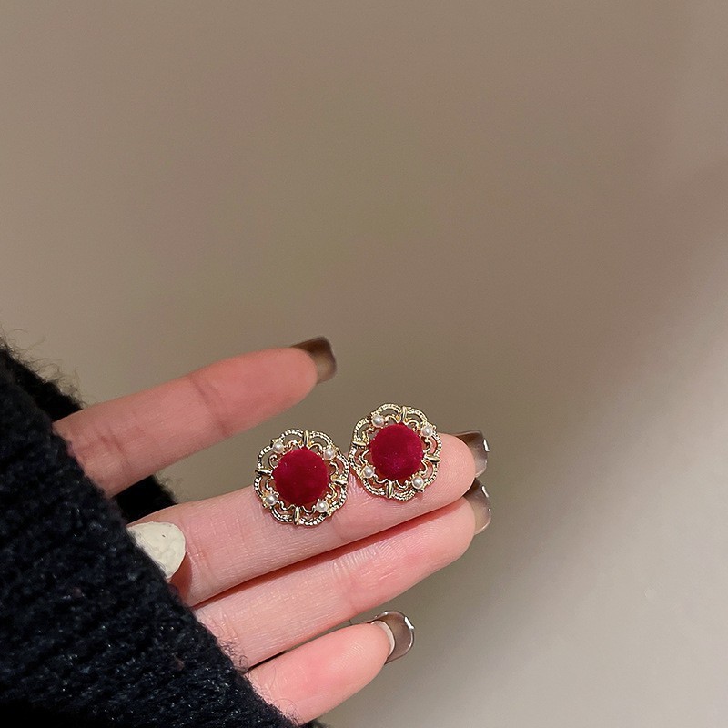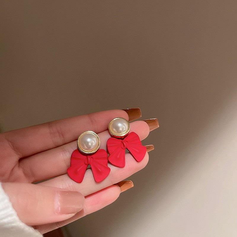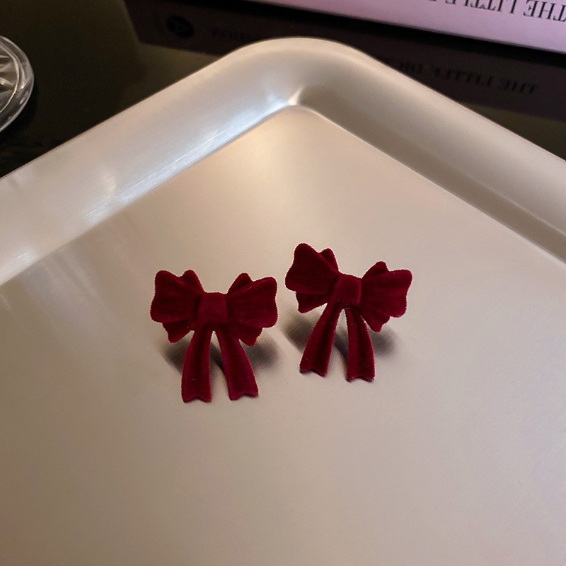 925银针新年红色系植绒耳环集合珍珠蝴蝶结耳钉复古气质秋冬耳饰
