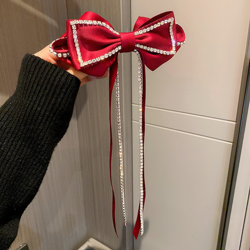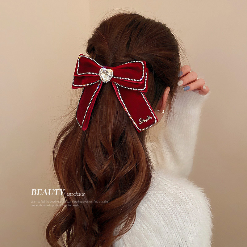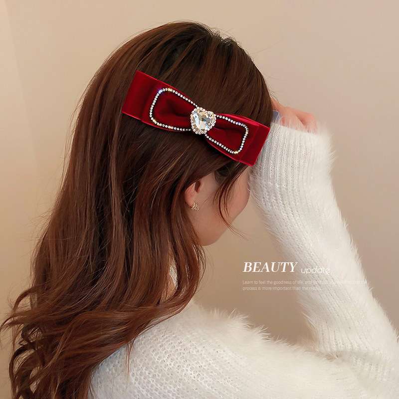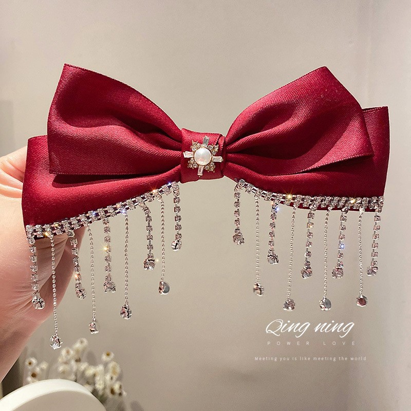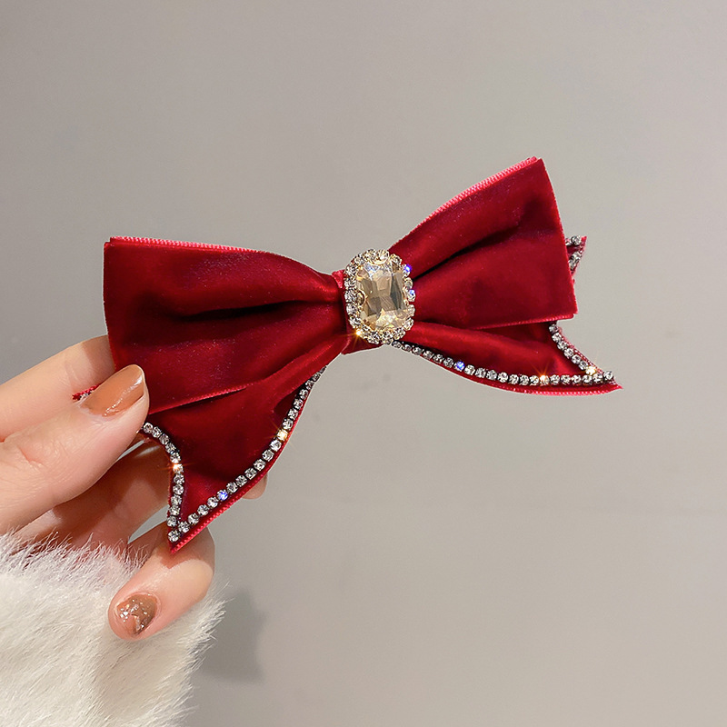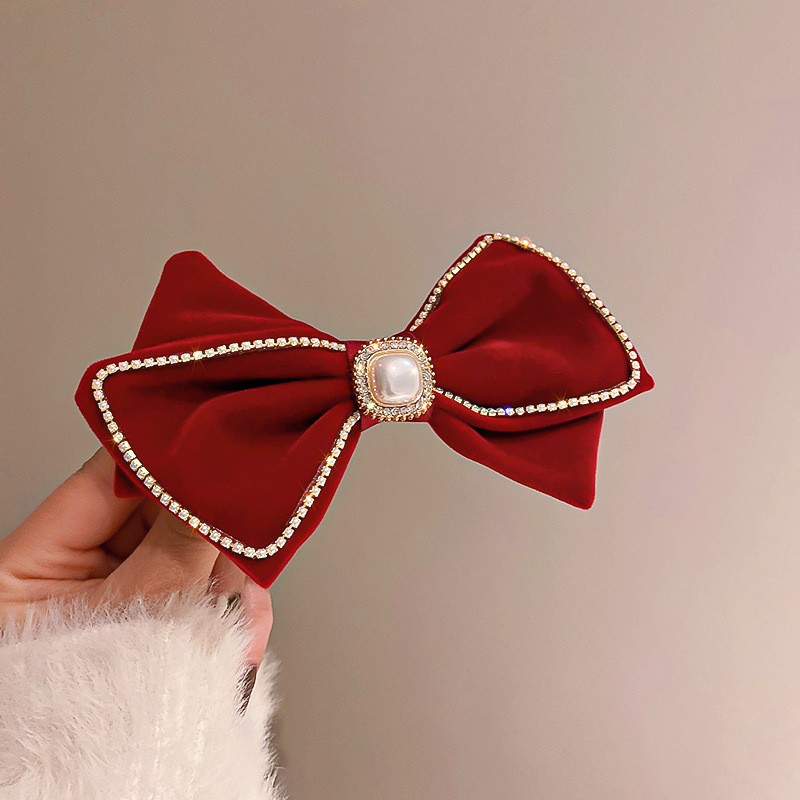 新年复古红色系发夹圣诞头饰镶钻珍珠布艺蝴蝶结弹簧夹网红发饰女