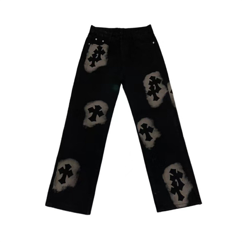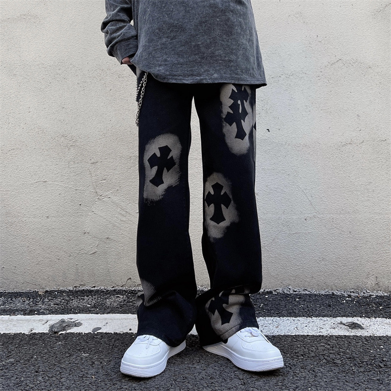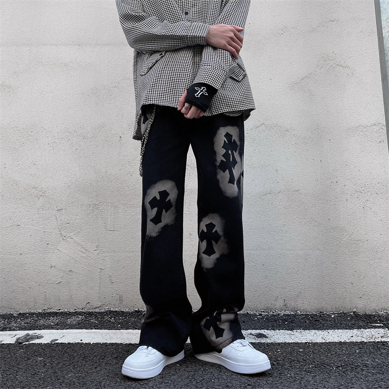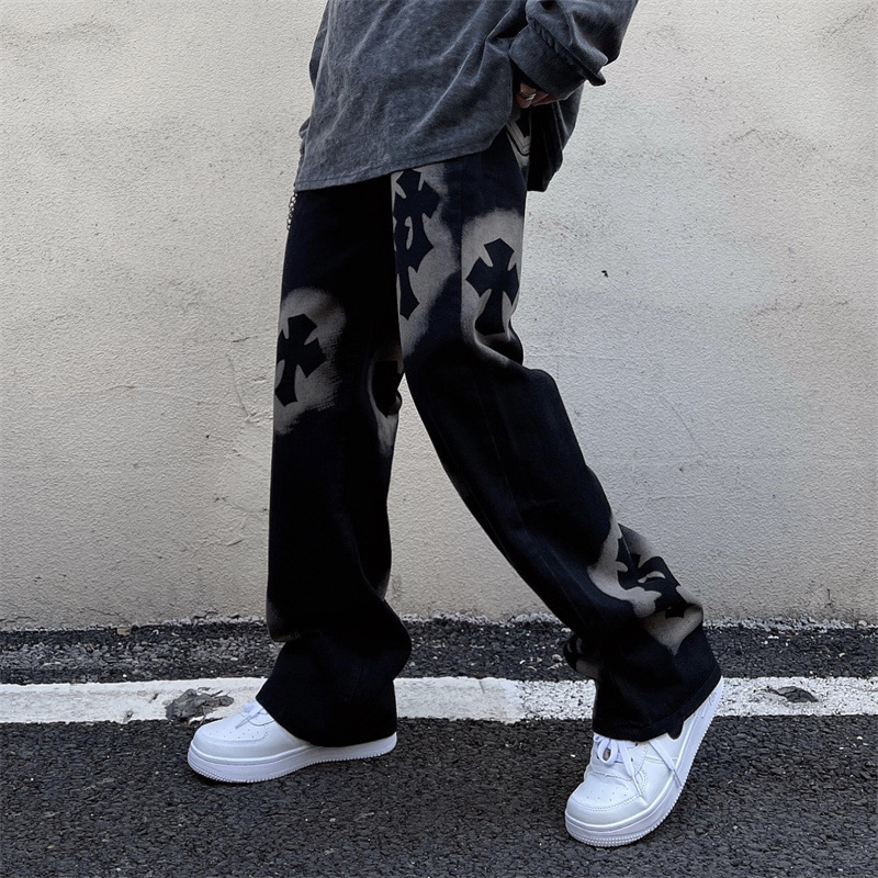 秋冬港风街头裤子设计感男ins复古字母直筒牛仔裤嘻哈宽松阔腿裤
