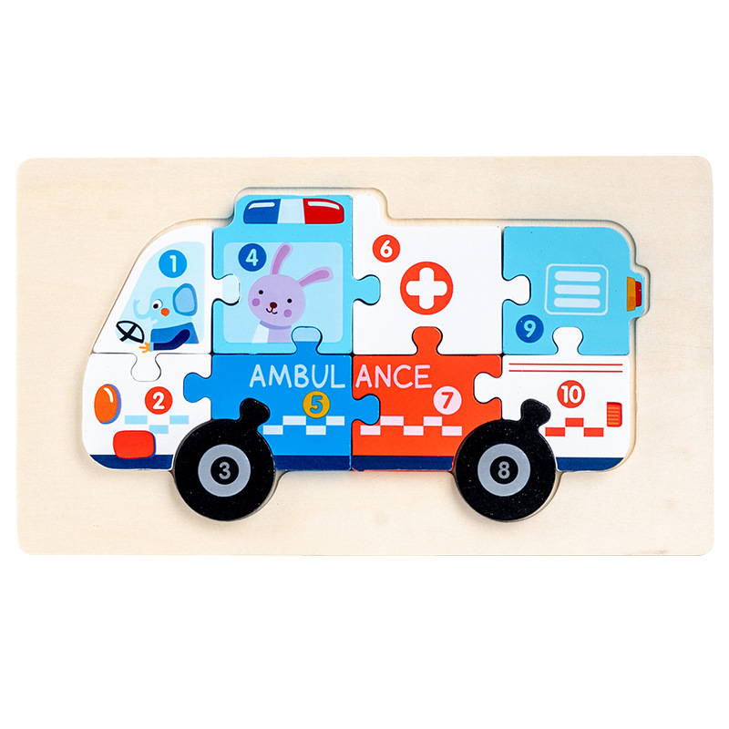 厂家木制3D卡扣立体拼图益智卡通交通数字早教认知手拼板儿童玩具