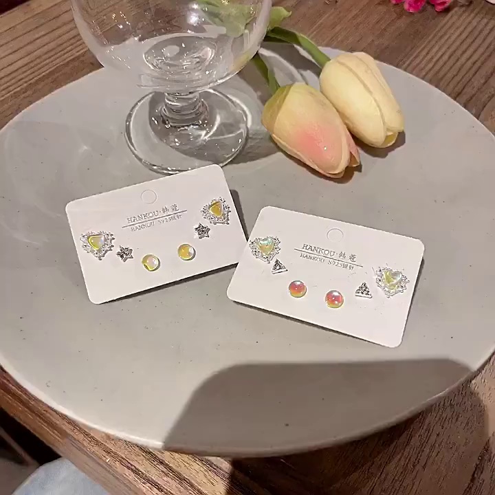 S925银针耳环小清新超仙气质梦幻爱心耳钉ins潮镶钻星星套装耳饰