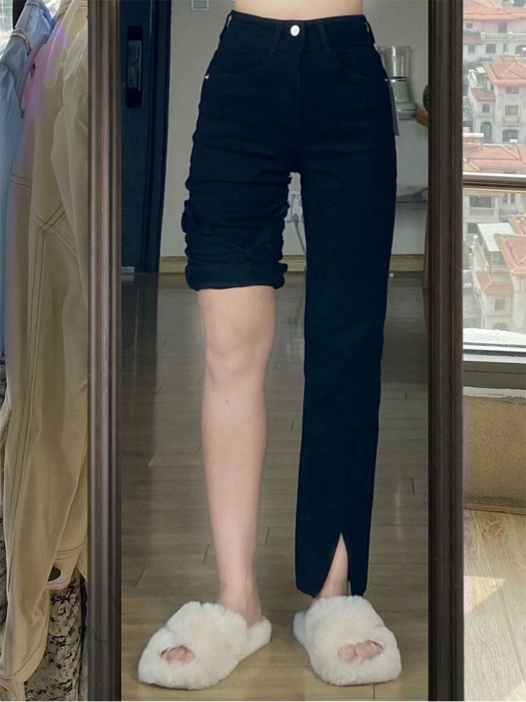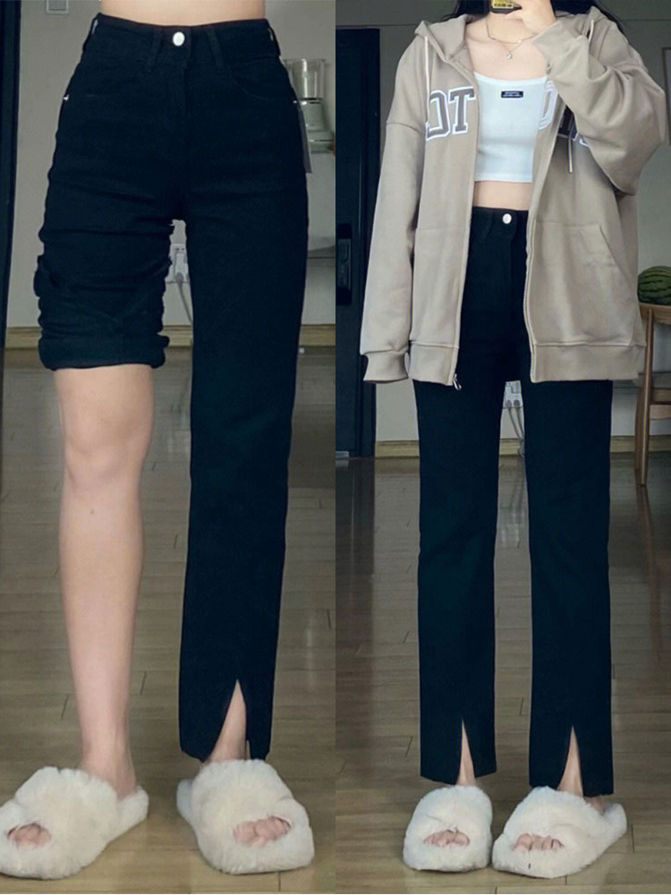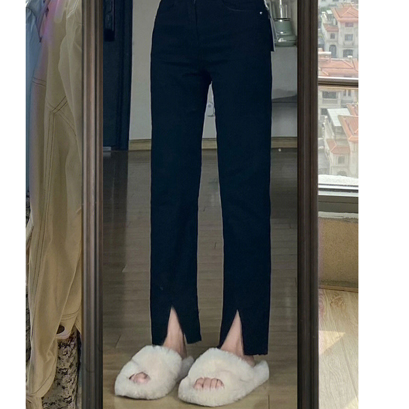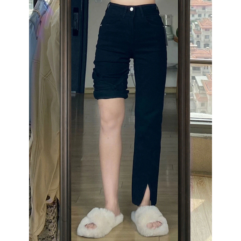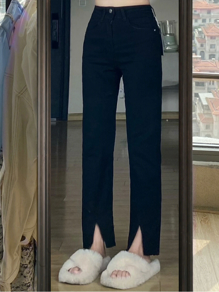 黑色开叉阔腿裤高腰牛仔裤女秋冬新款韩版显瘦百搭休闲直筒裤子潮