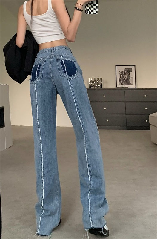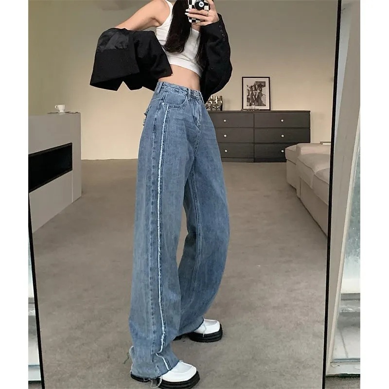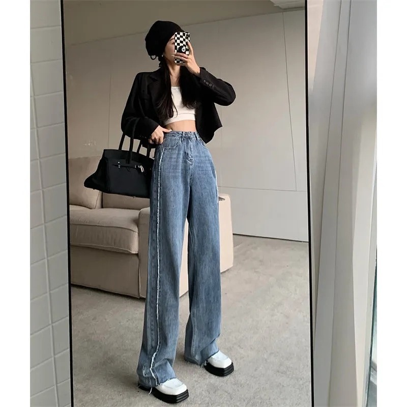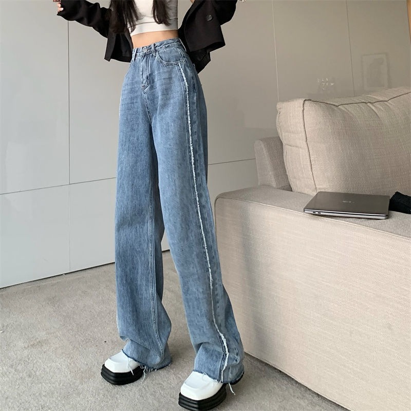 复古高街毛边牛仔裤女新款春季宽松显瘦直筒垂感阔腿长裤拖地