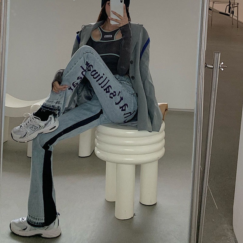 跨境新款复古宽松字母刺绣直筒牛仔裤女高腰垂感拼色拖地微喇长裤