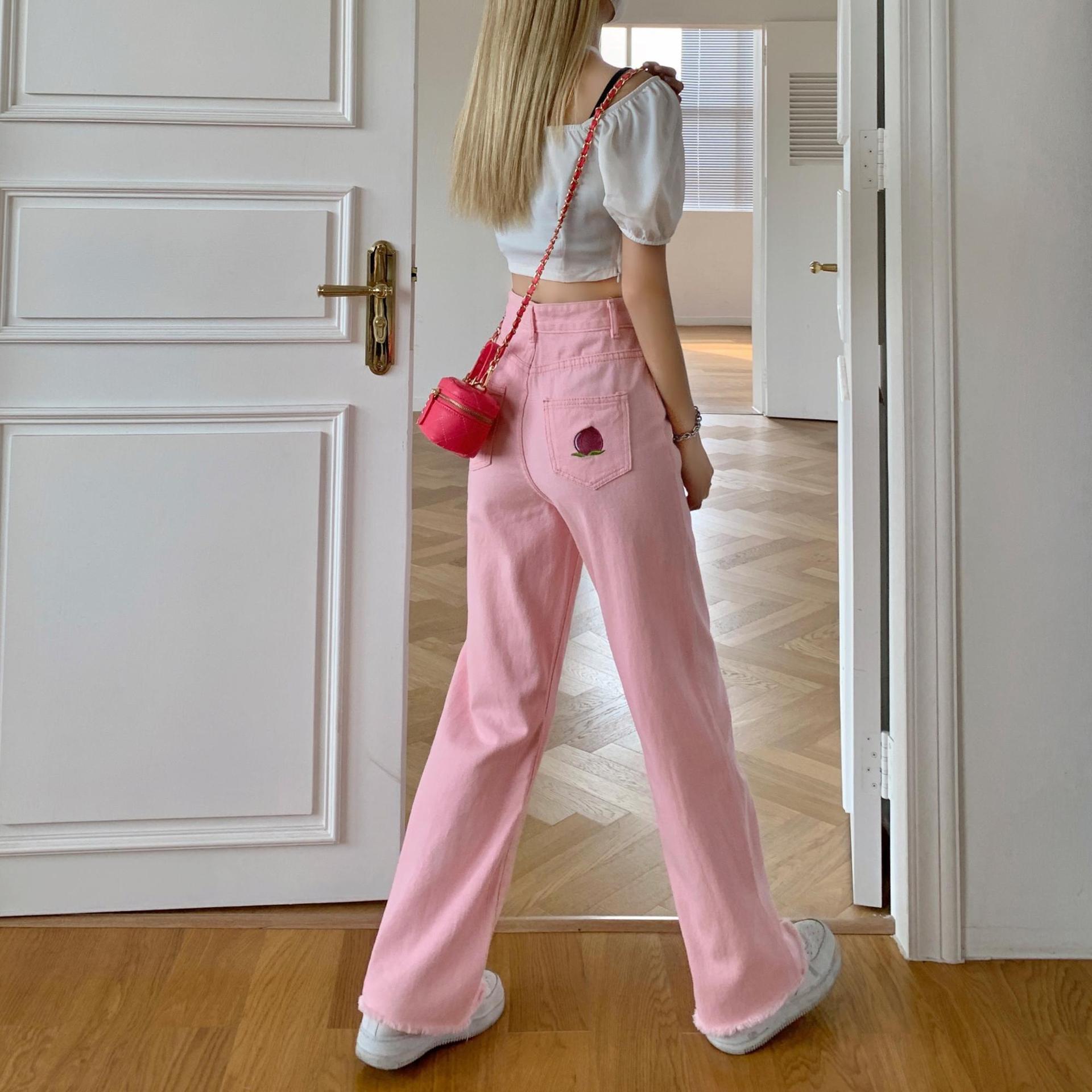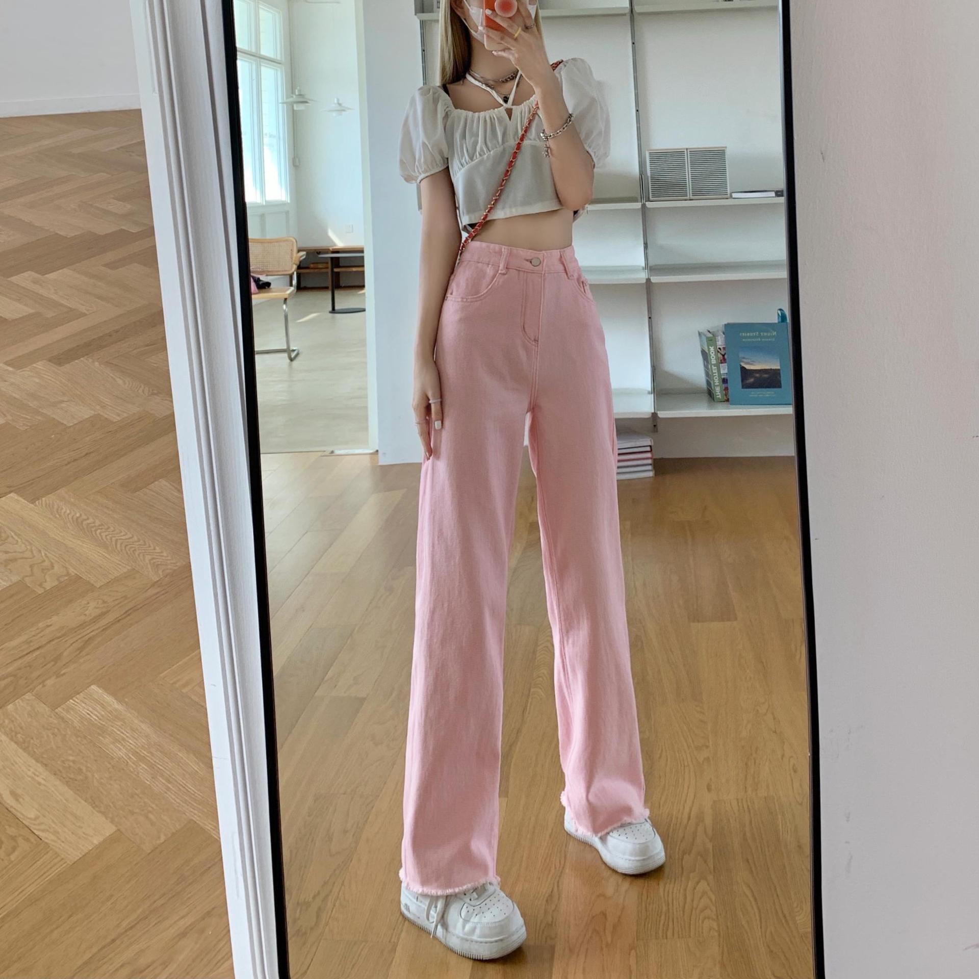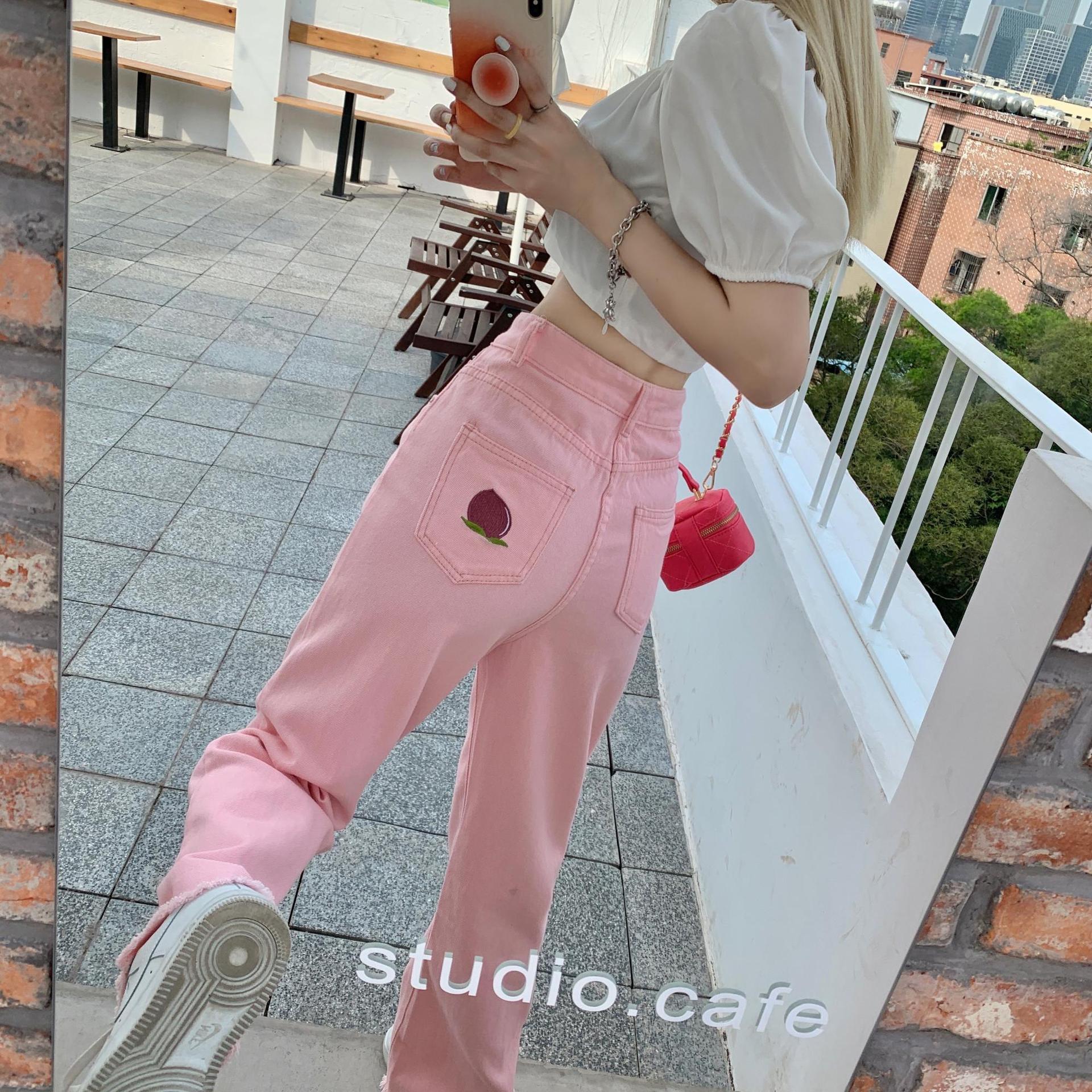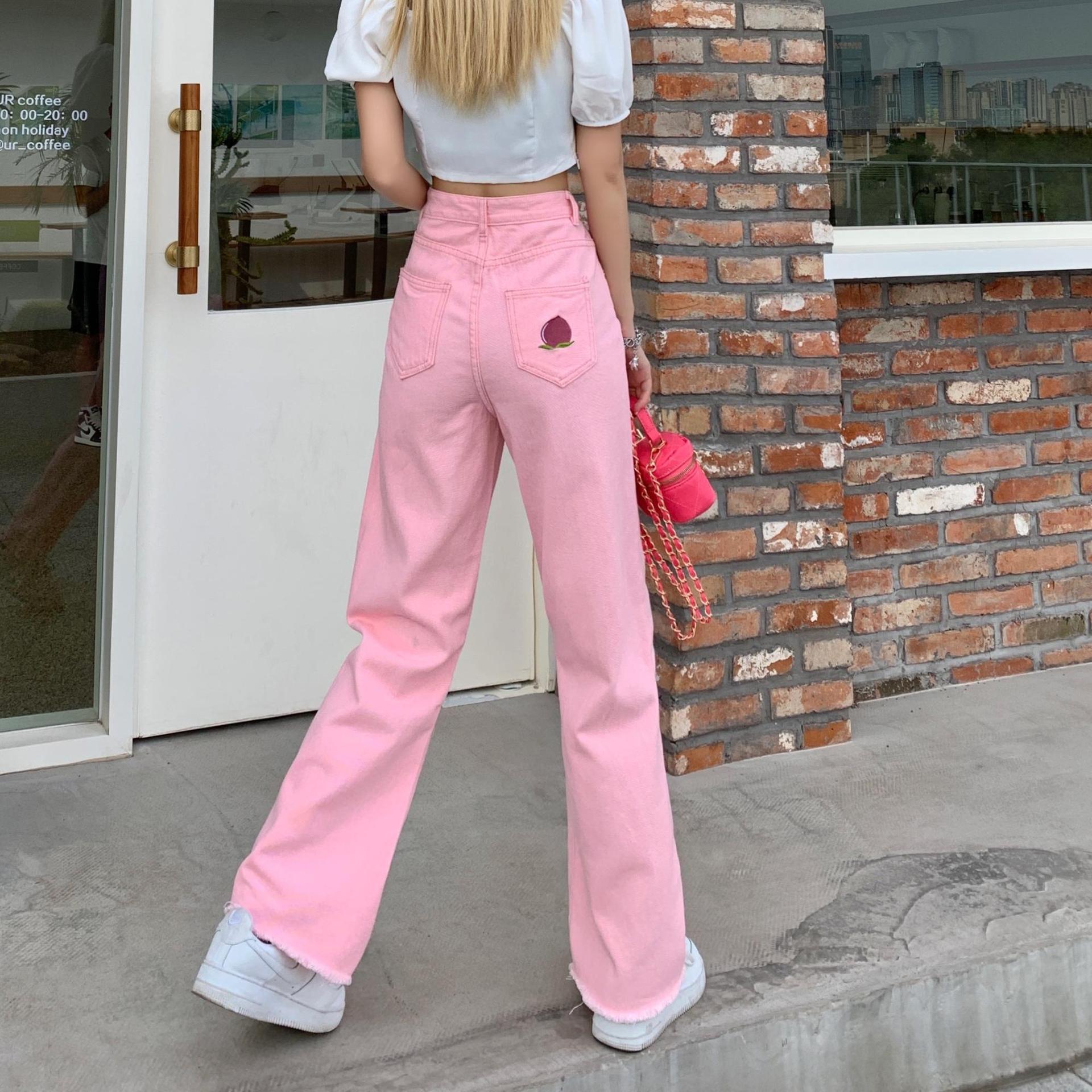 韩版春夏季新款女装软妹刺绣粉色阔腿牛仔裤高腰显瘦直筒长裤毛边
