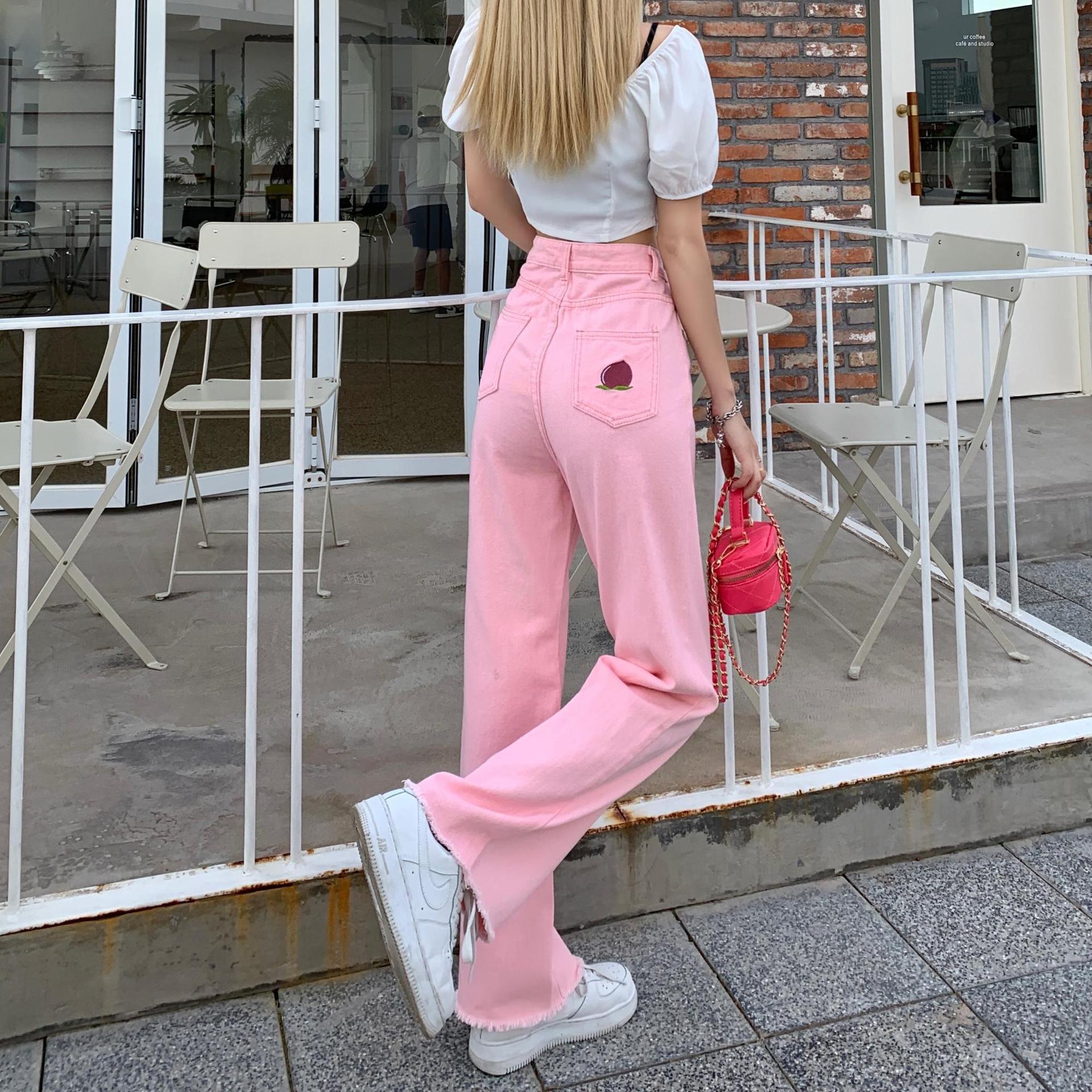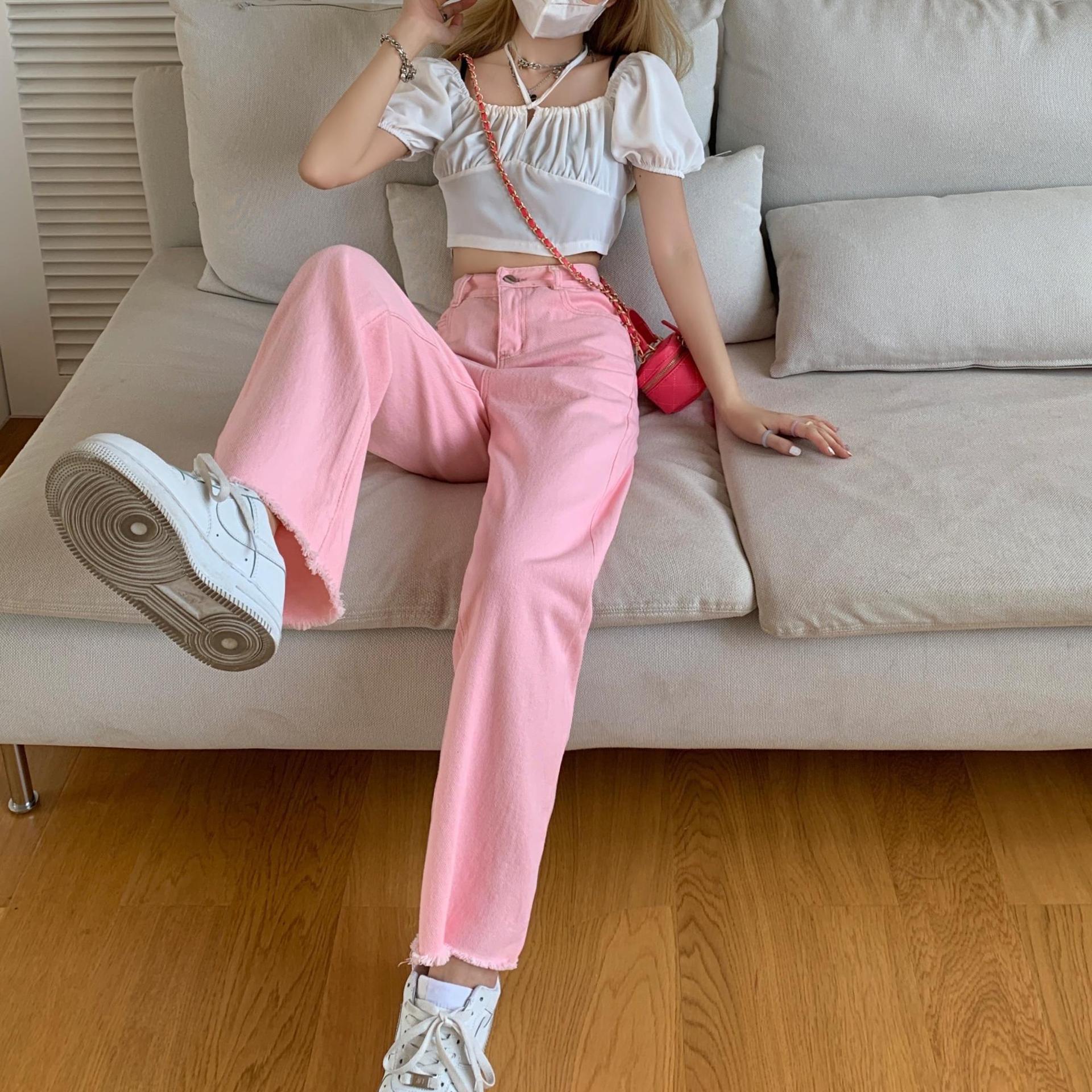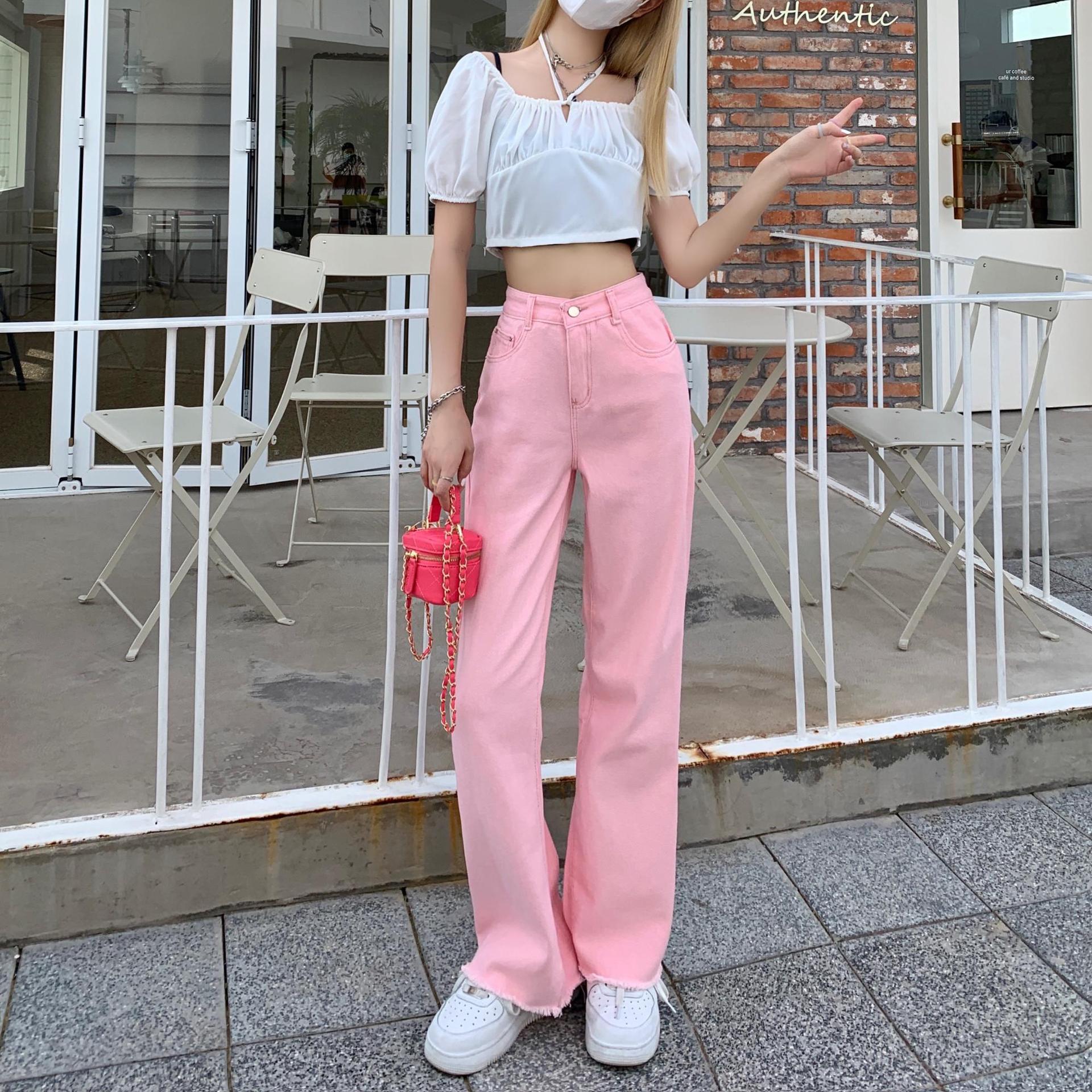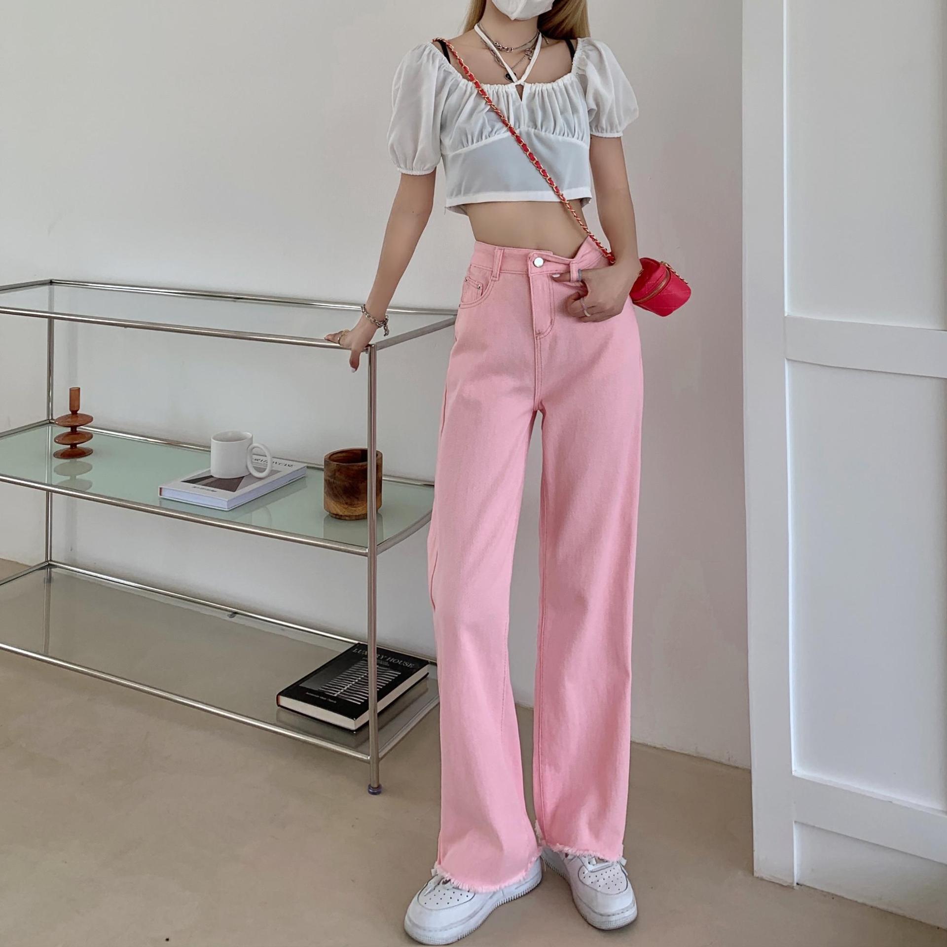韩版春夏季新款女装软妹刺绣粉色阔腿牛仔裤高腰显瘦直筒长裤毛边