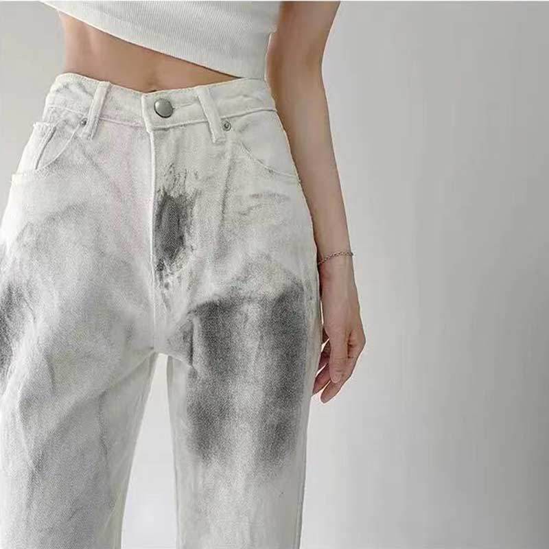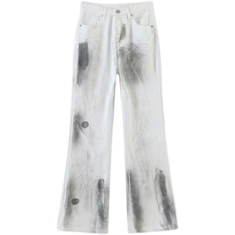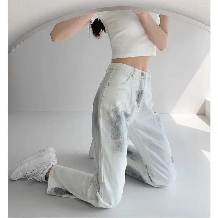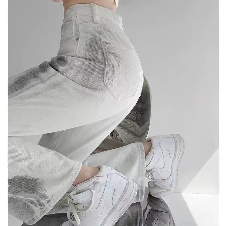 扎染泼墨牛仔裤女春秋季新款大码胖mm白色直筒宽松高腰长裤潮