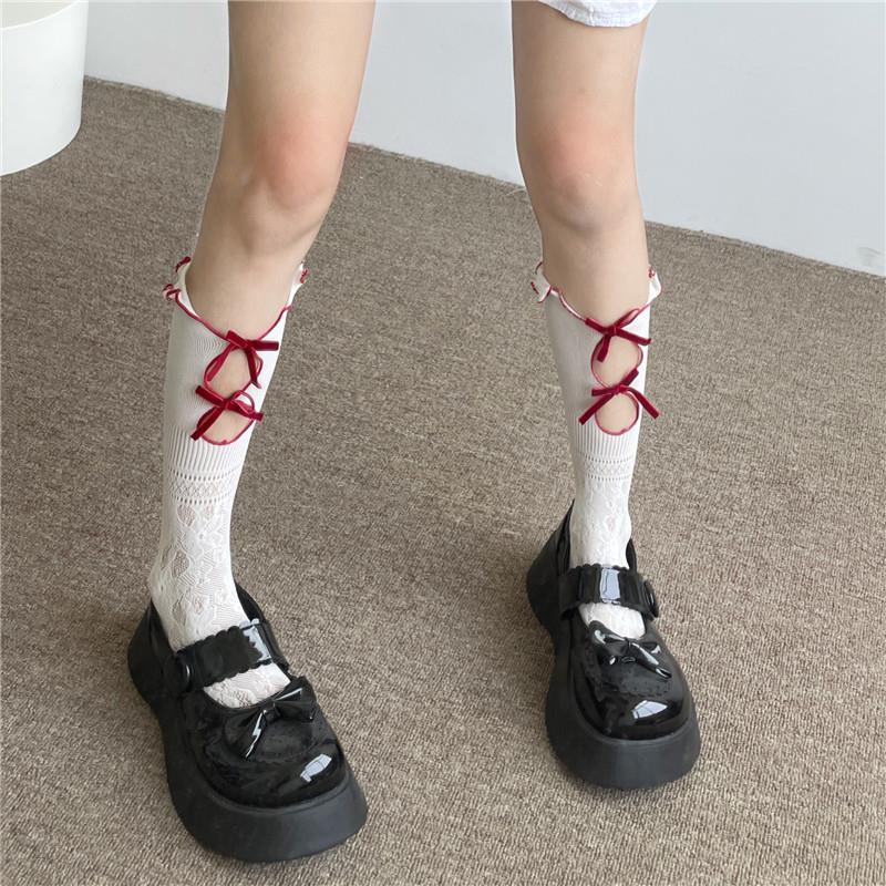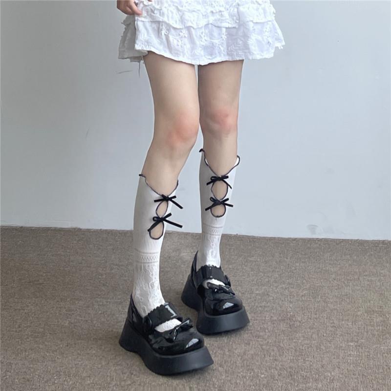 设计款蝴蝶结镂空小腿袜辣妹可爱日系纯欲风袜子花卉图案中筒袜女