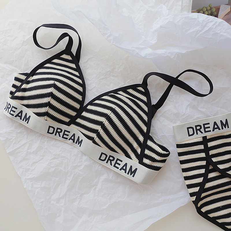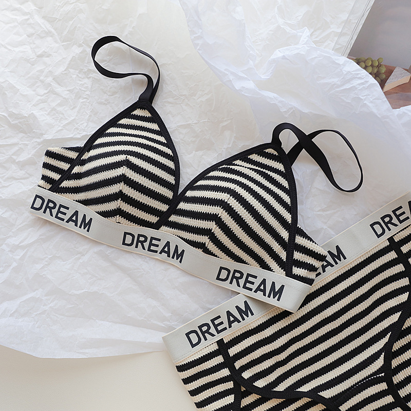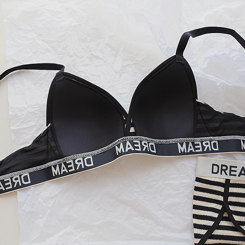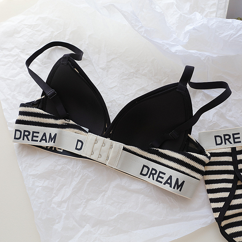 欧美复古条纹字母性感三角杯无痕内衣无钢圈薄款小胸显小文胸套装