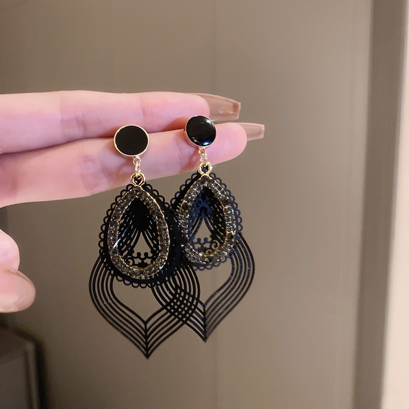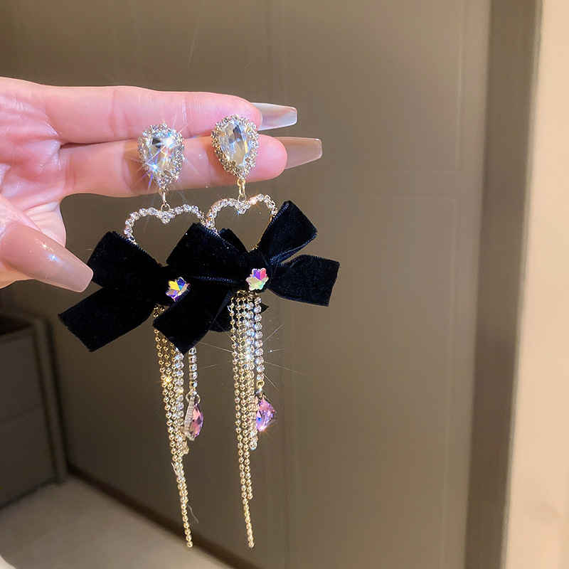 银针黑色蝴蝶结珍珠流苏耳环法式轻奢气质耳钉耳坠高级感耳饰批发