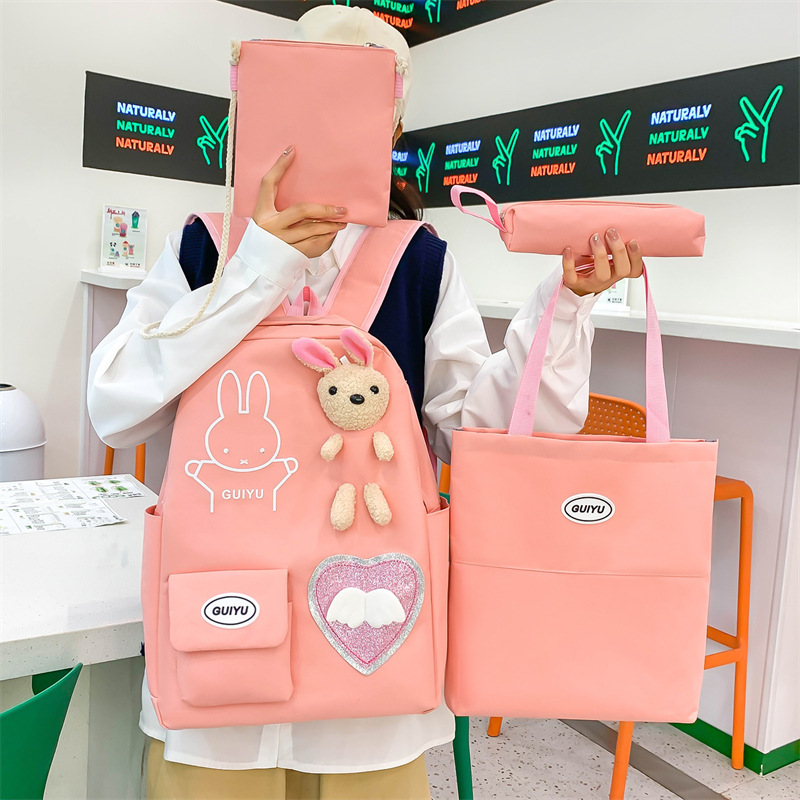 批发卡通爱心双肩包小学生书包补课袋四件套小兔子玩偶学生包