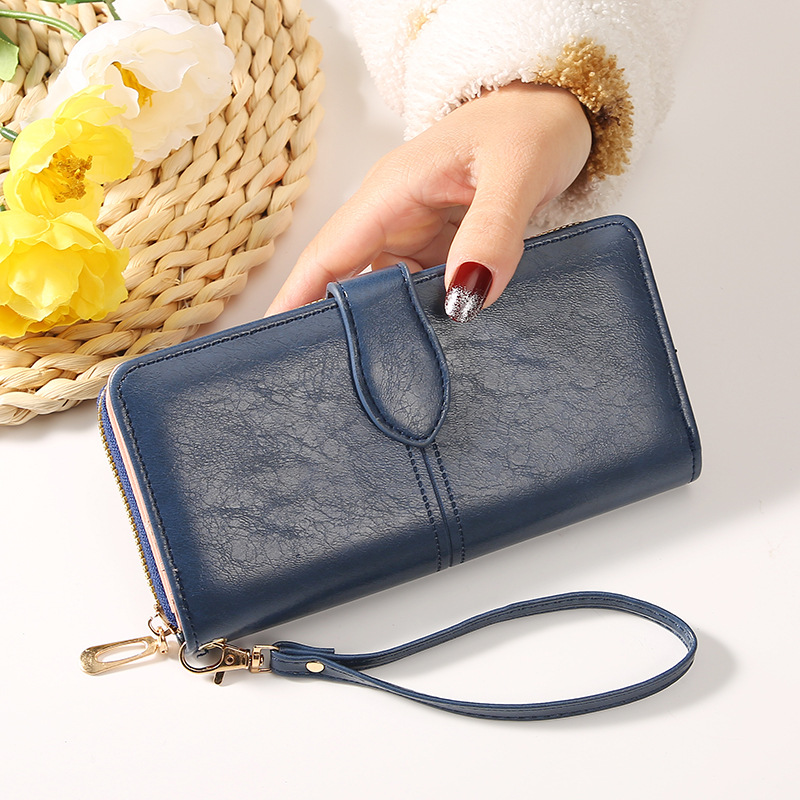 跨境女士钱包油蜡皮复古长款钱包女大容量多功能拉链搭扣手机包女