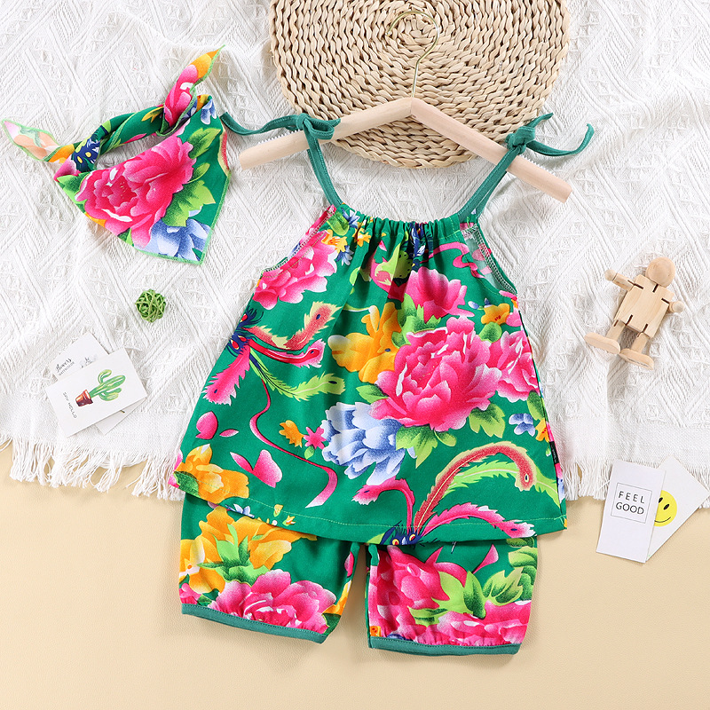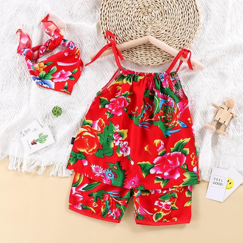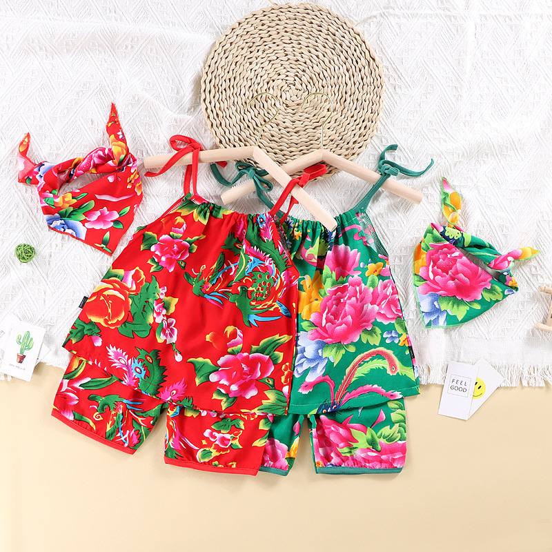 儿童东北风格家居服套装 婴儿绵绸东北大花夏季男女童短袖套装