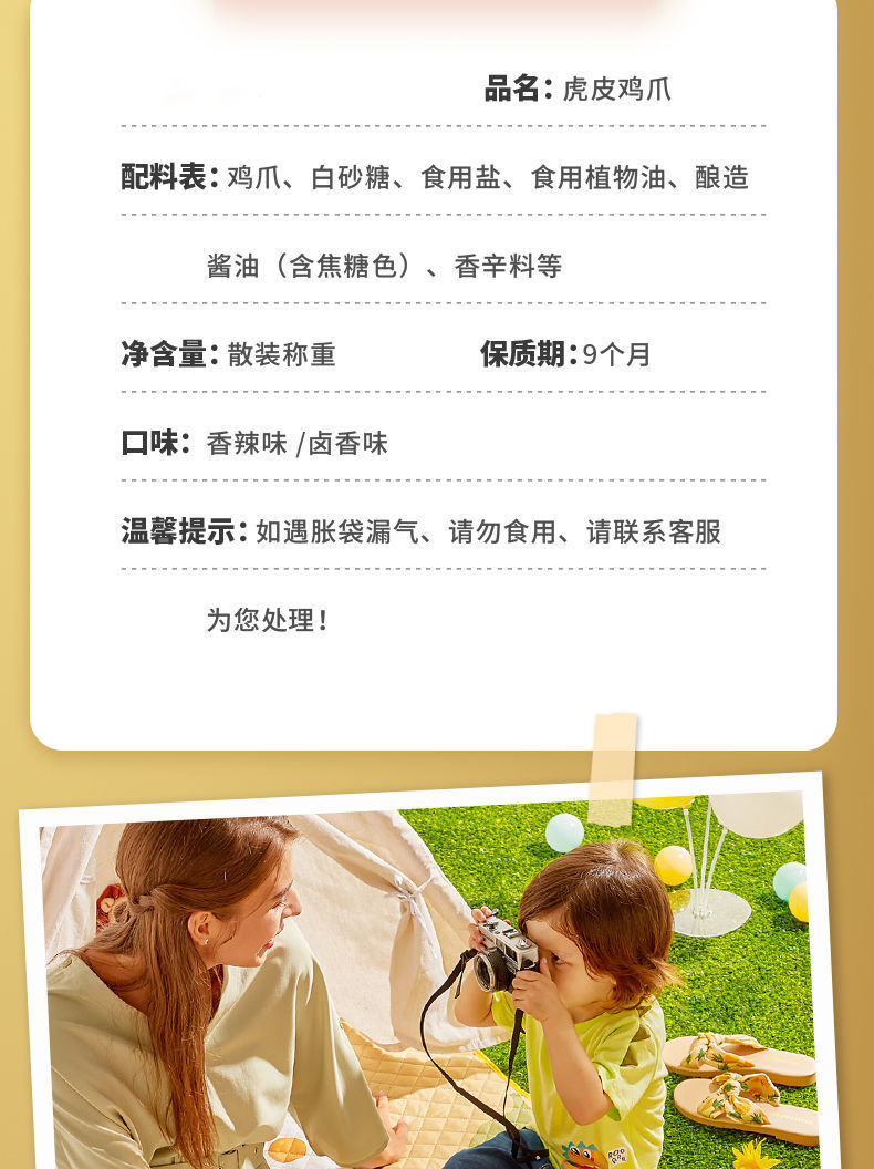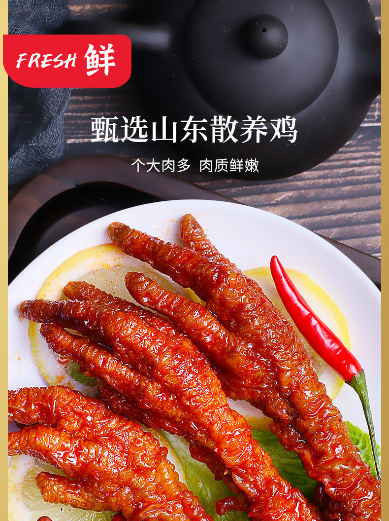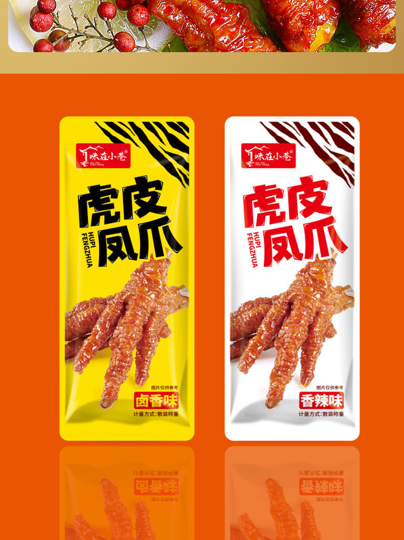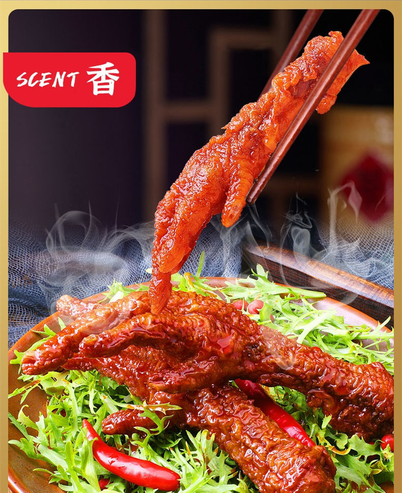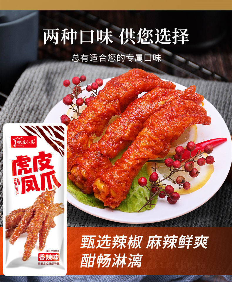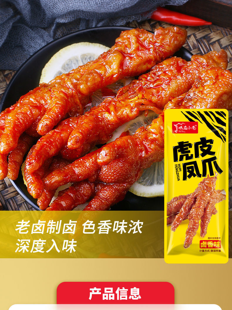 | flavor of meat stewed with soy sauce + fried chicken claw-1 pack(卤香味+虎皮凤爪-1包) | USD $0.19 | 760185 pack available |