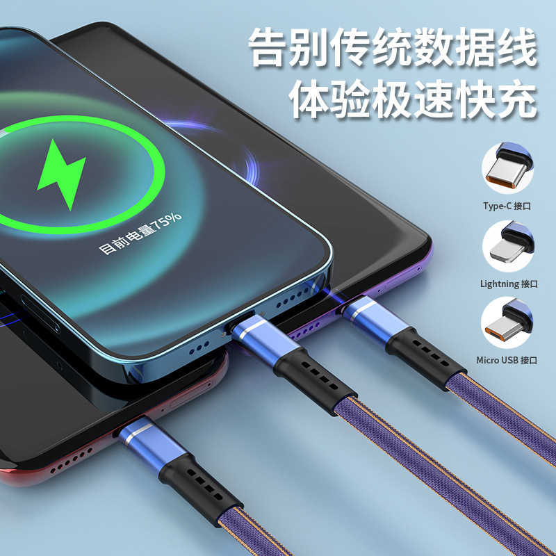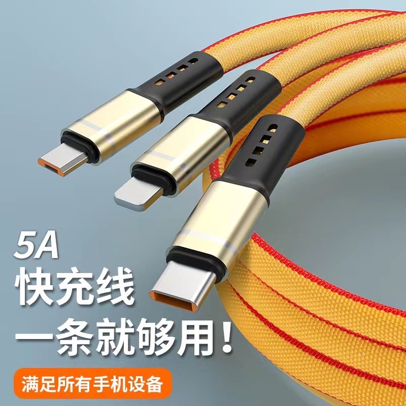 【产品亮点】:一线三头设计,一条线解决所有手机充电,布编加粗手感更好,耐拉伸,防缠绕,智能涓流,达5A快充,Type-c接口支持数据传输