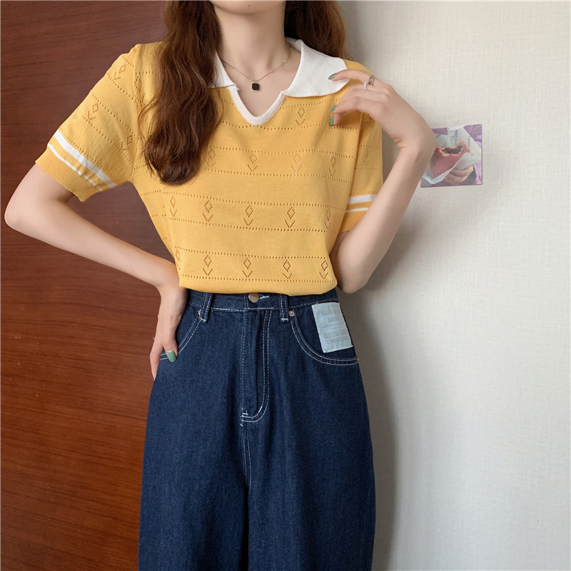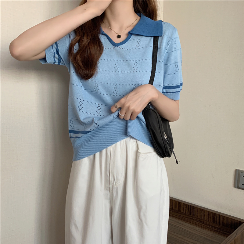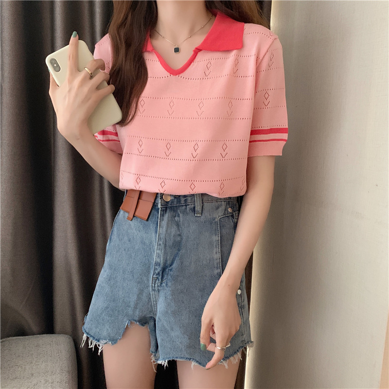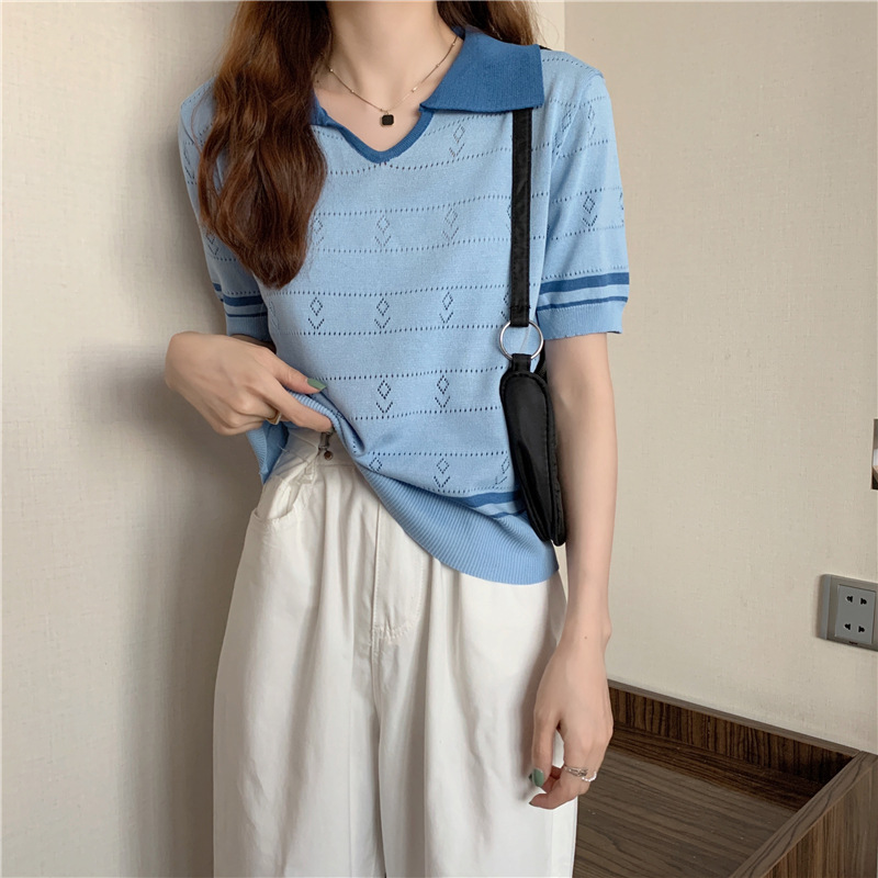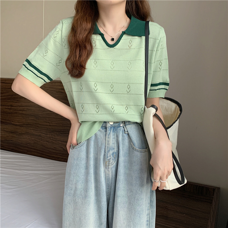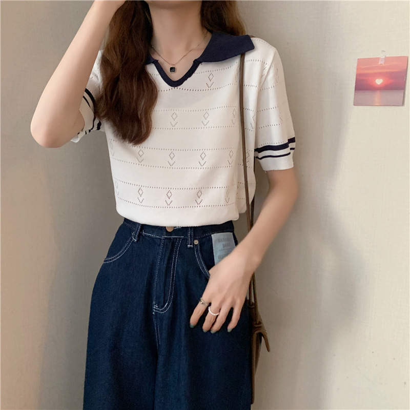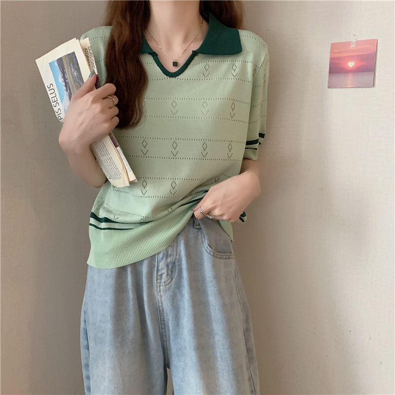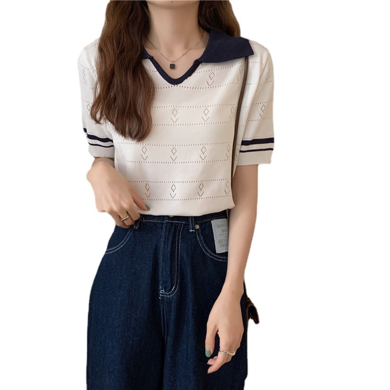 夏季2022年新款韩风撞色条纹翻领短袖针织衫外穿短款上衣女打底衫