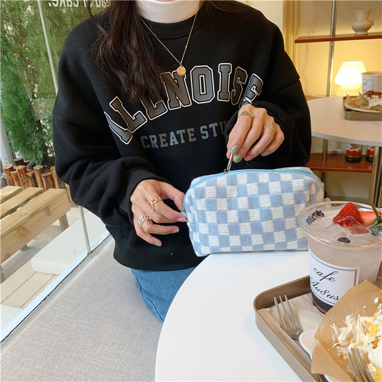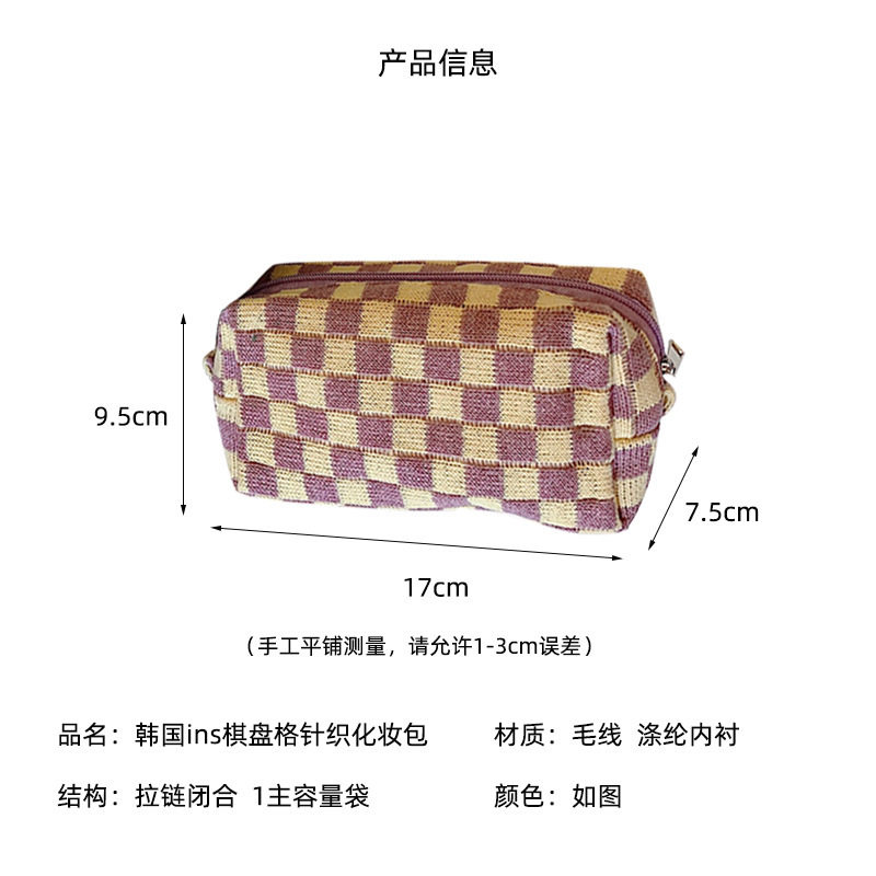 韩国棋盘格针织化妆包撞色毛线收纳包洗漱包便携大容量整理
