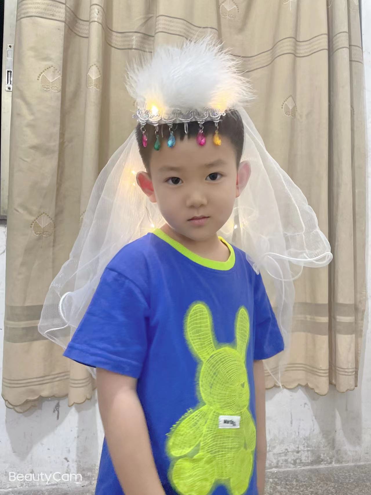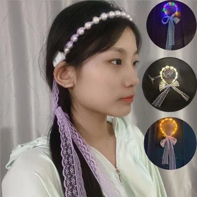 网红头纱带灯发光双层流苏珍珠皇冠双层丝带蝴蝶结头纱头饰饰品批