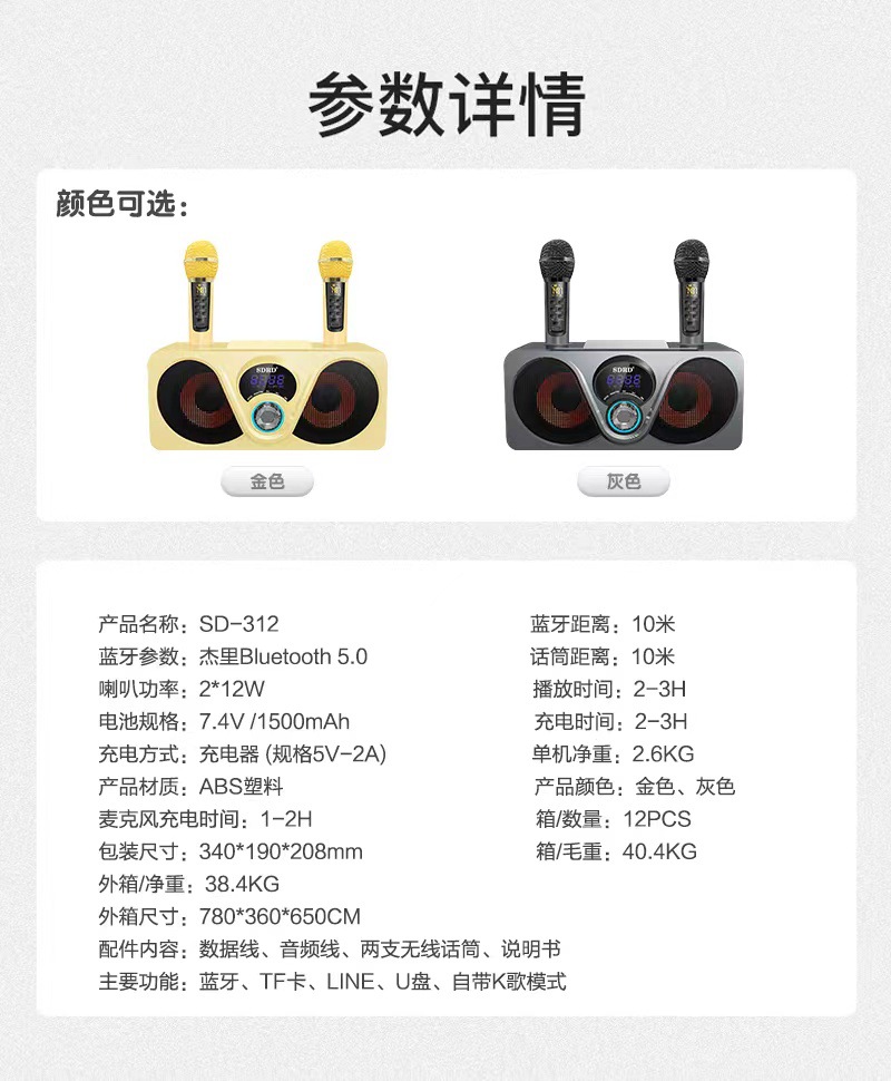 新款SD312蓝牙音箱家庭式麦克风户外双喇叭重低音K歌无线便携一体