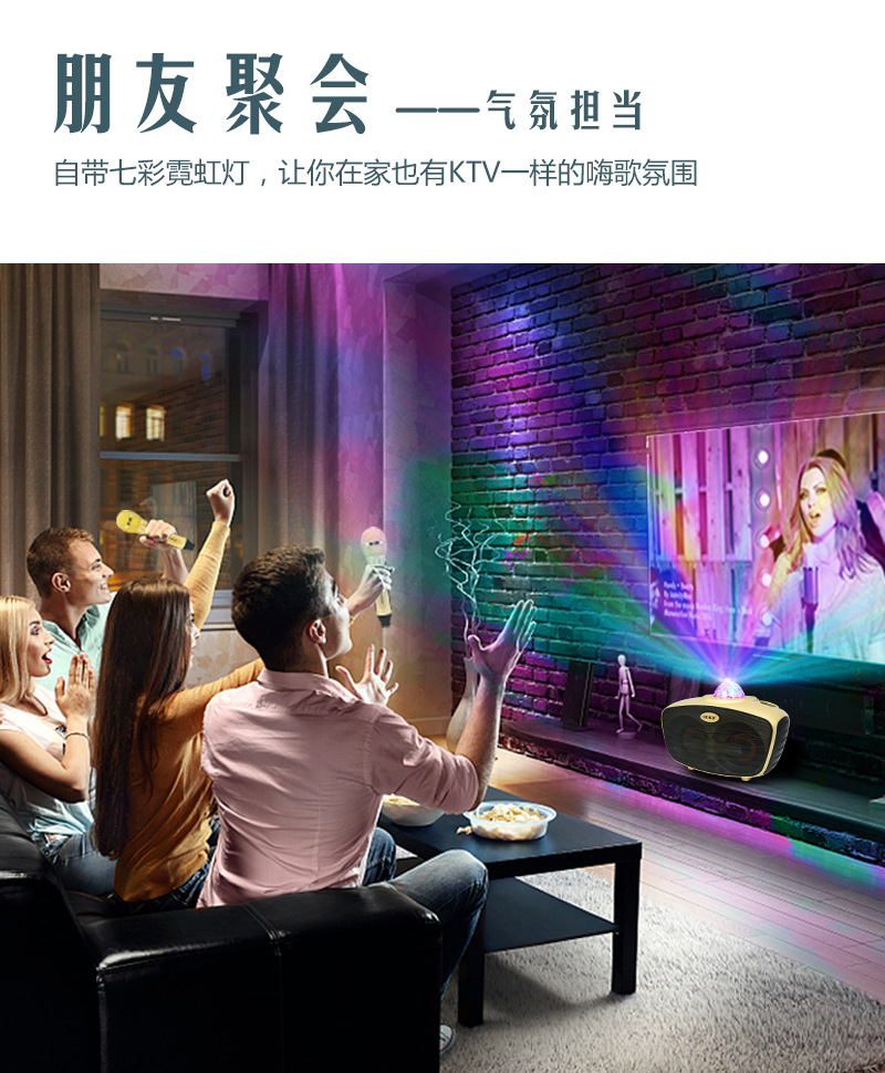 音箱功能:无线蓝牙/支持U盘、支持AUX音频输入/支持插TF卡/一键消音/自带K歌/七彩灯