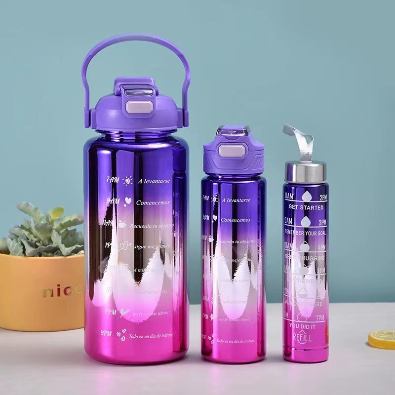 渐变水杯吸管杯带刻度塑料杯电镀三件套大容量运动水壶套杯太空杯